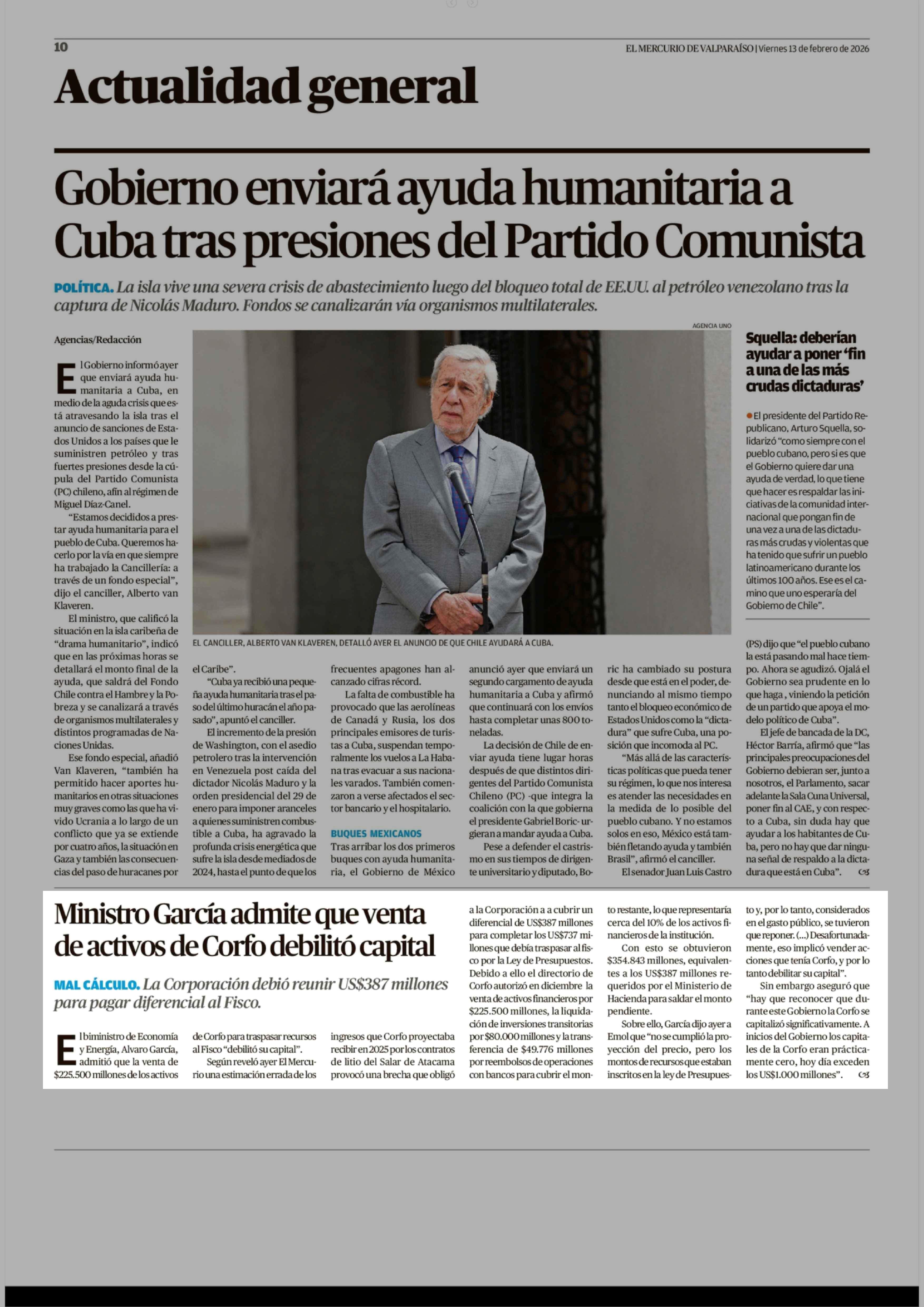 Ministro García admite que venta de activos de Corfo debilitó capital 13-02-2026 El Mercurio de Valparaíso |