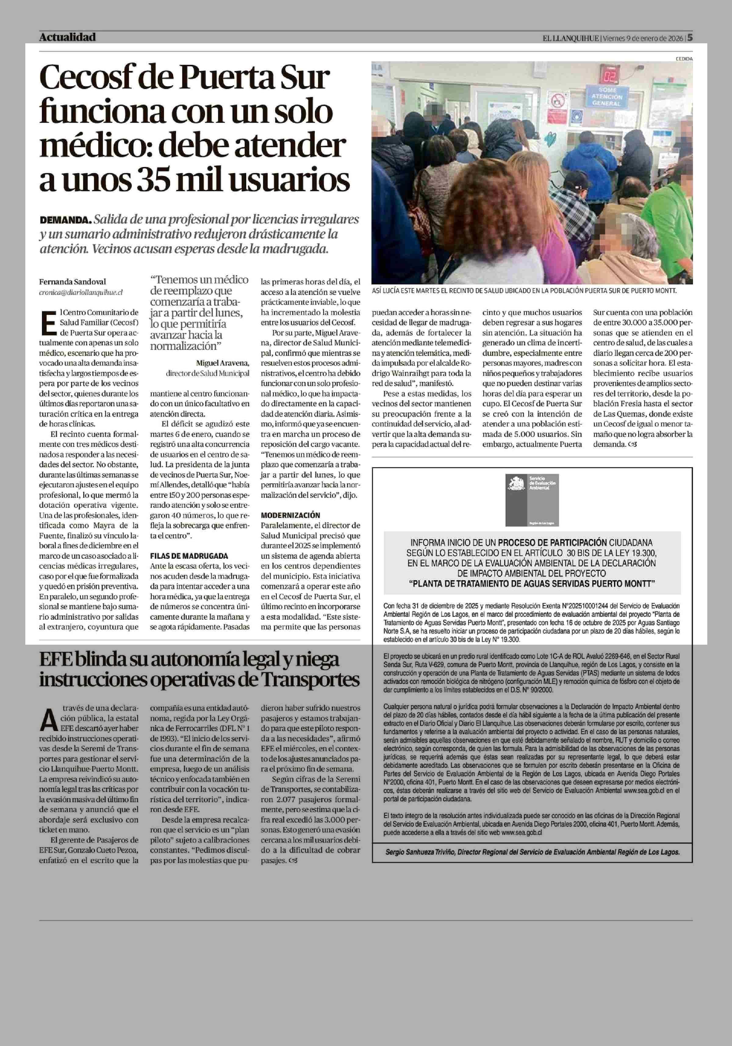 Cecosf de Puerta Sur funciona con un solo médico: debe atender a unos 35 mil usuarios 09-01-2026 El Llanquihue |
