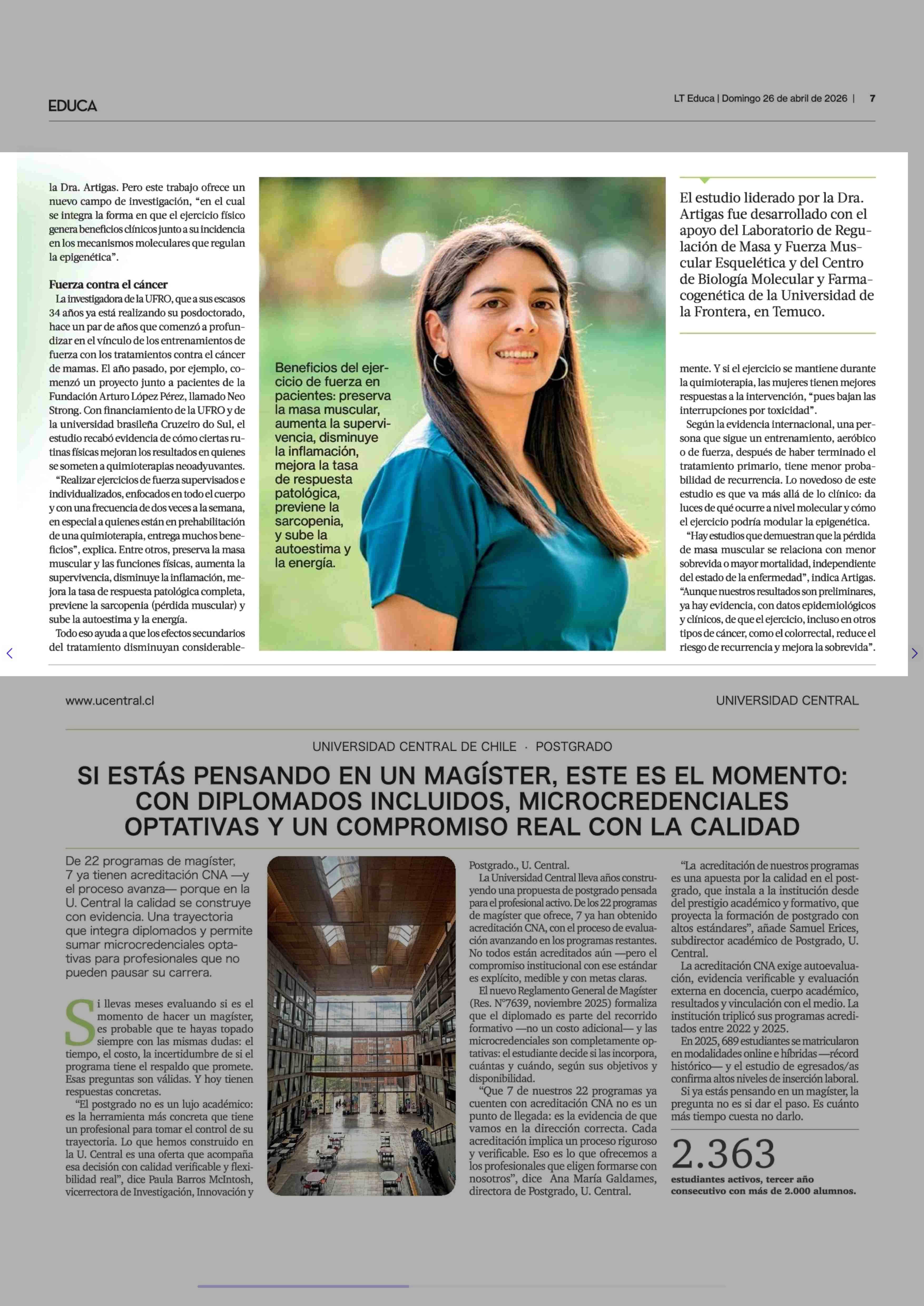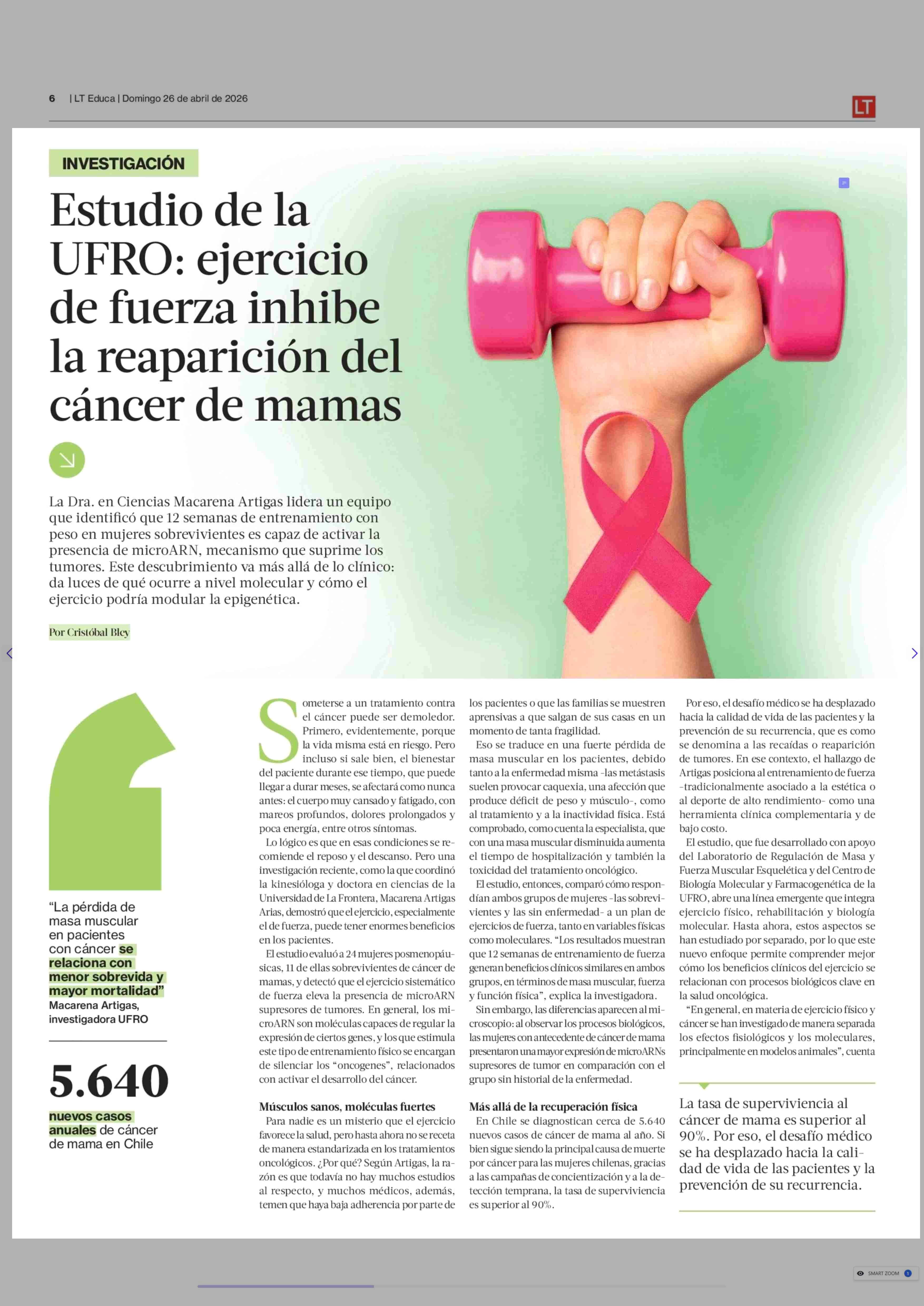 Estudio de la UFRO: ejercicio de fuerza inhibe la reaparición del cáncer de mamas 26-04-2026 La Tercera |