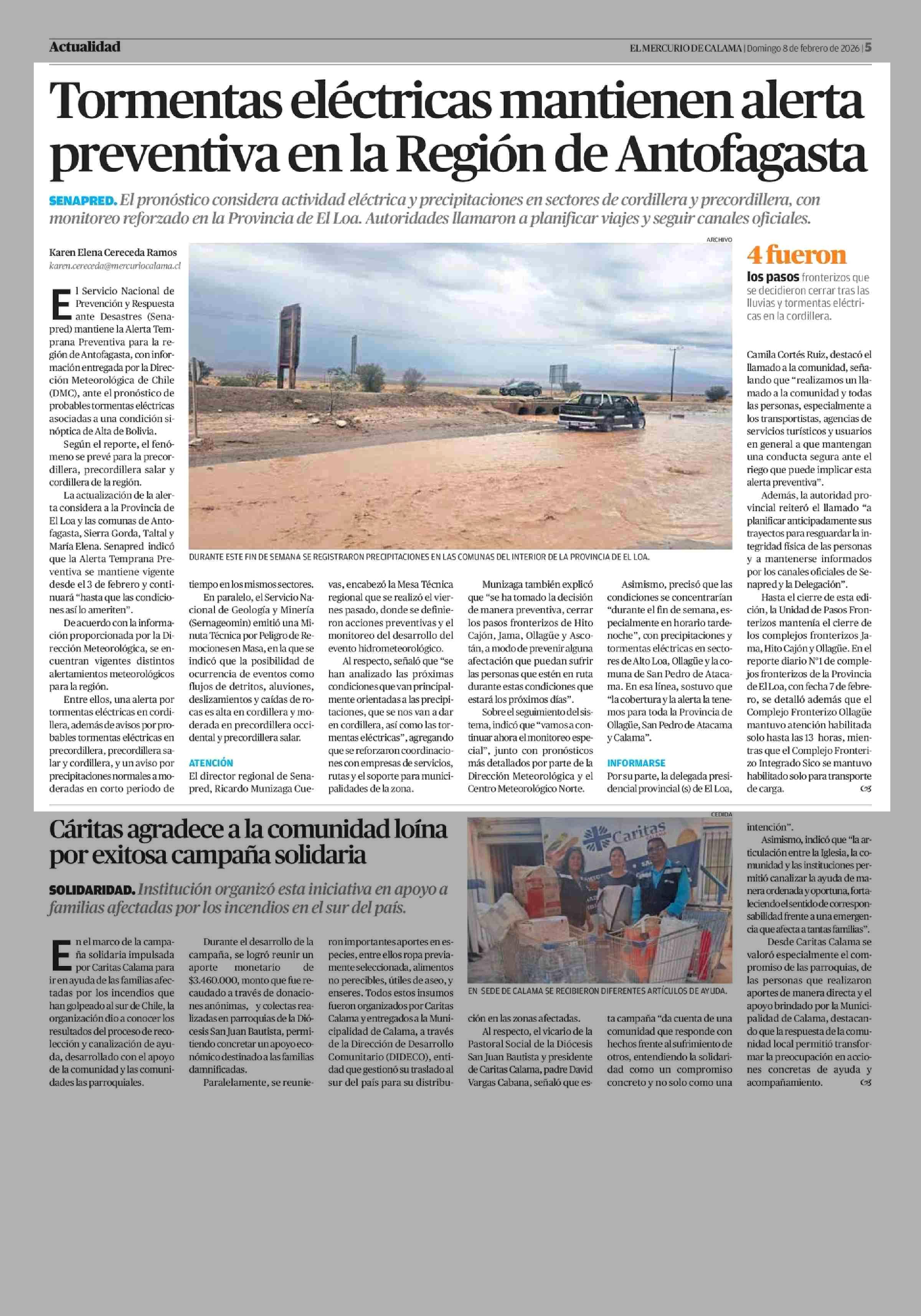 Tormentas eléctricas mantienen alerta preventiva en la Región de Antofagasta 08-02-2026 El Mercurio de Calama |
