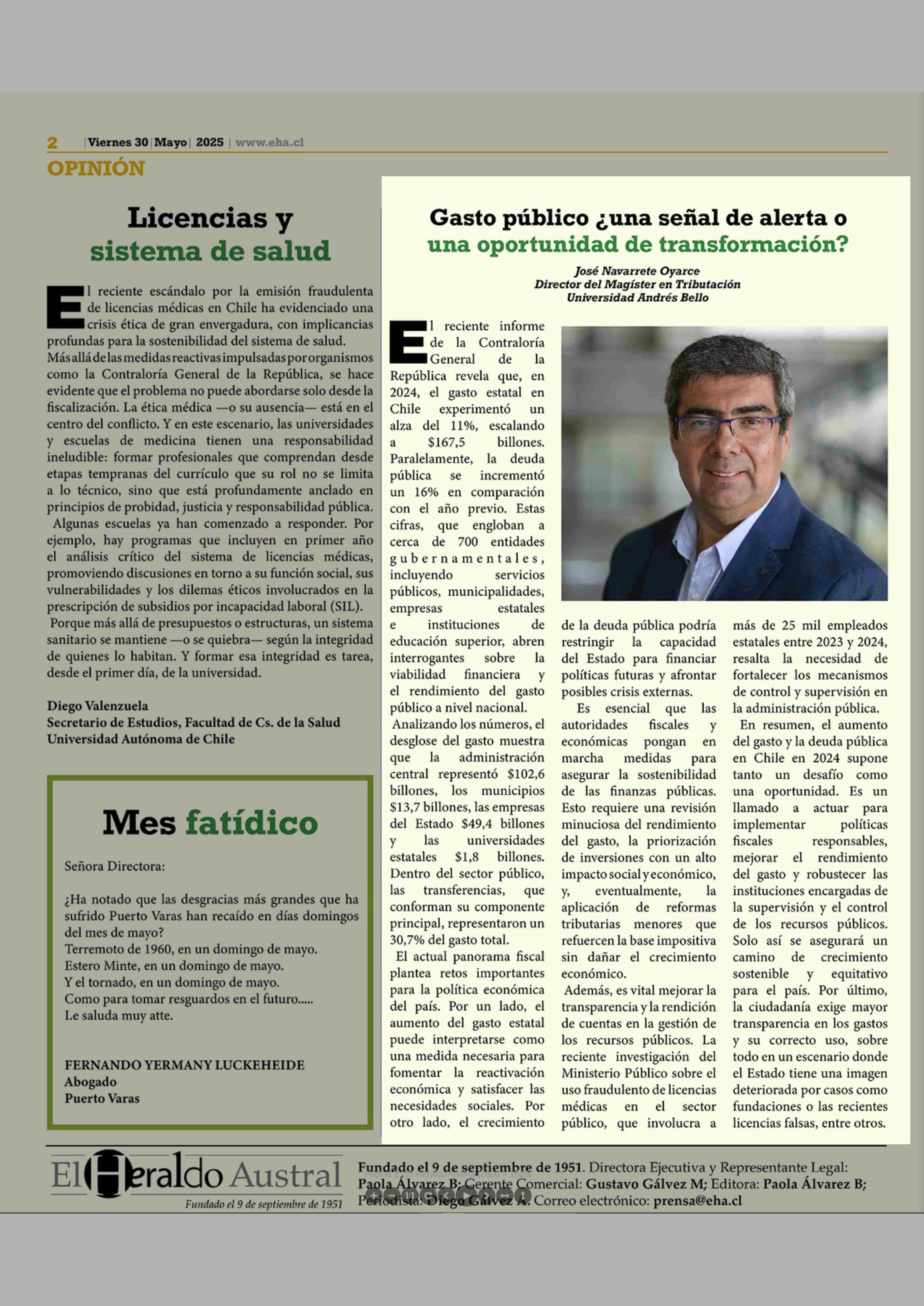 COLUMNAS DE OPINIÓN: Gasto público ¿una señal de alerta o una oportunidad de transformación? 30-05-2025 El Heraldo Austral |