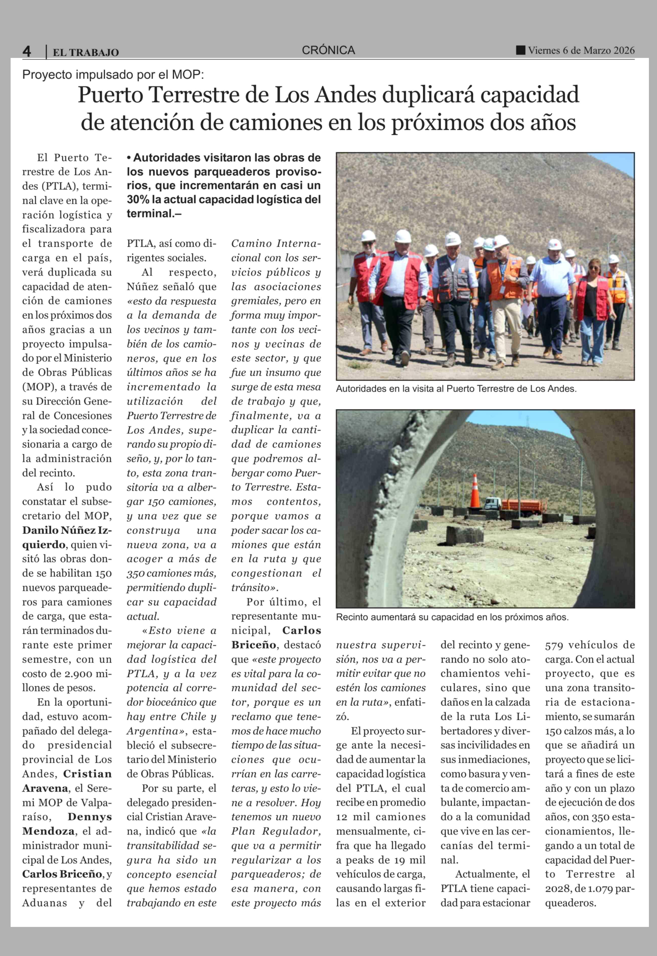Puerto Terrestre de Los Andes duplicará capacidad de atención de camiones en los próximos dos años 06-03-2026 El Trabajo |