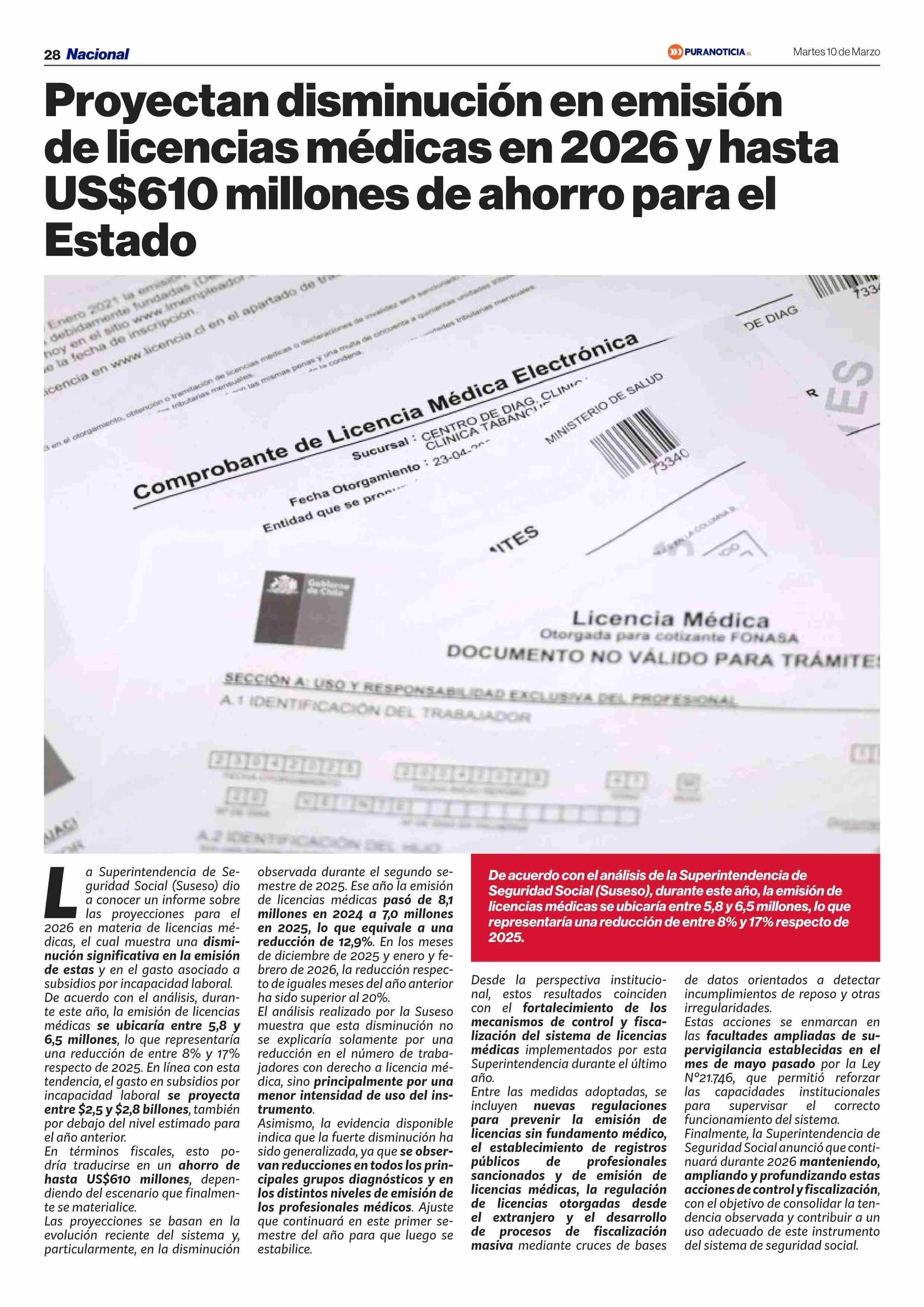 Proyectan disminución en emisión de licencias médicas en 2026 y hasta US$610 millones de ahorro para el Estado 10-03-2026 Puranoticia.cl |