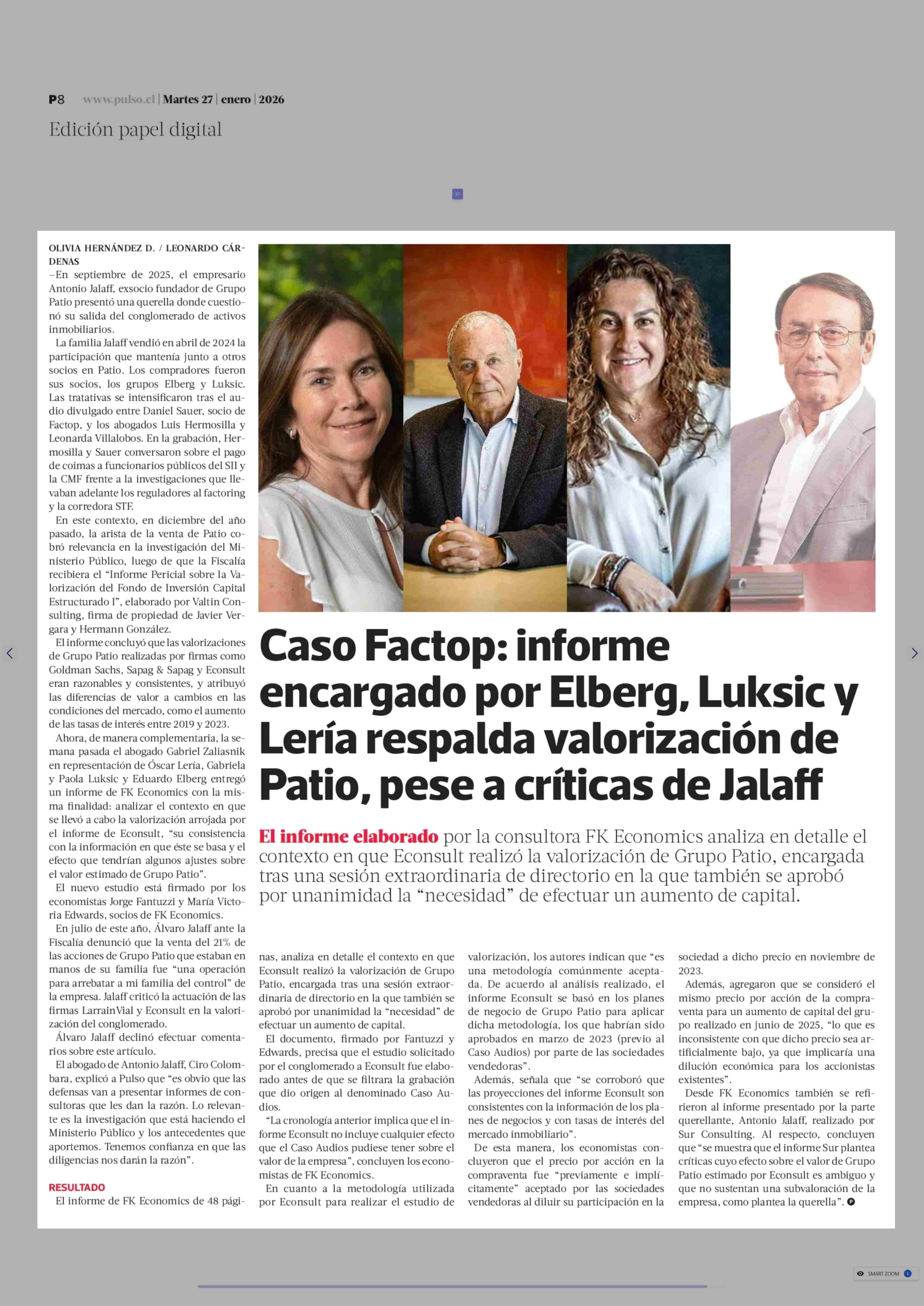 Caso Factop: informe encargado por Elberg, Luksic y Lería respalda valorización de Patio, pese a críticas de Jalaff 27-01-2026 La Tercera |