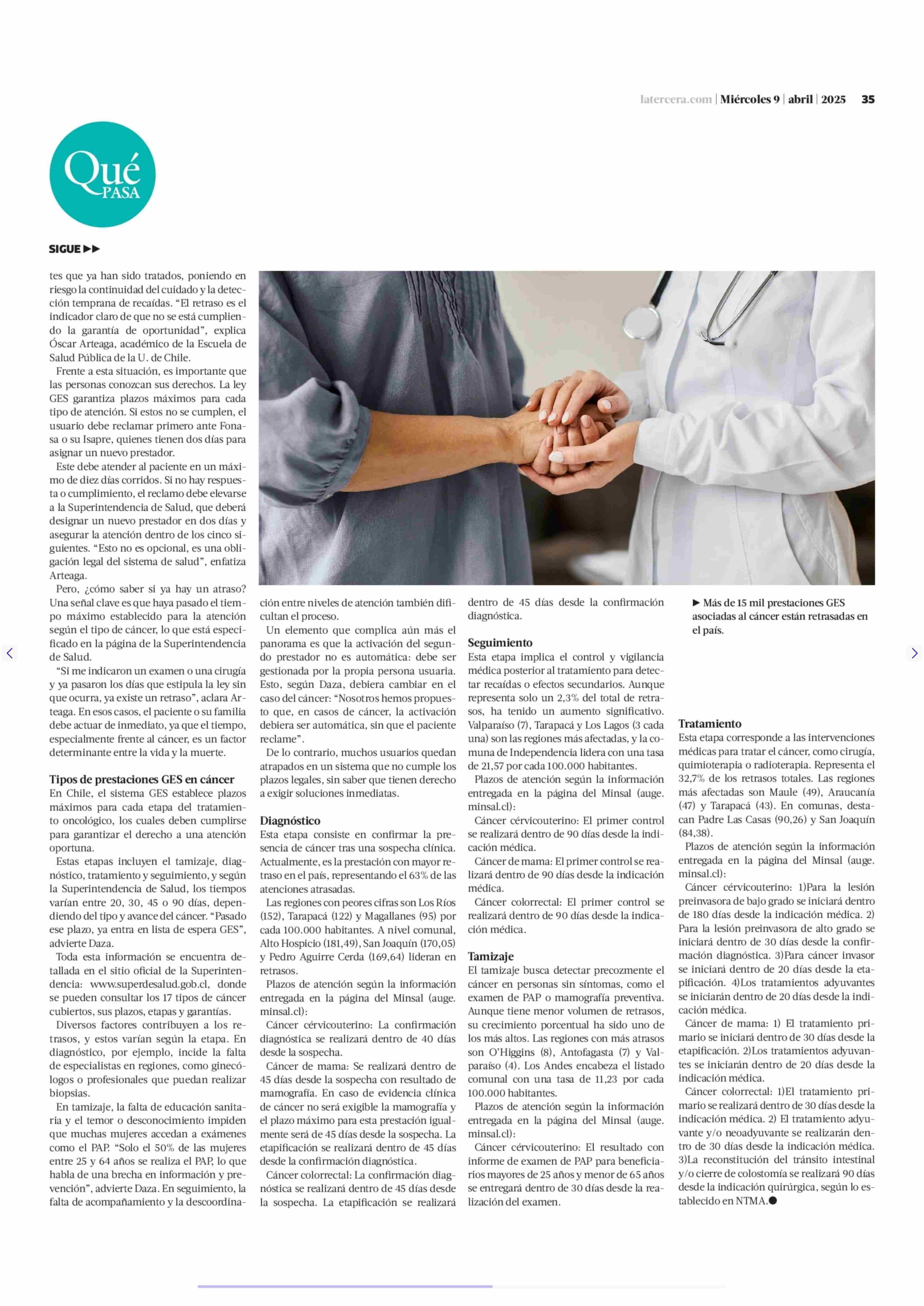Seis de cada diez cánceres en Chile asociados al GÉS no son confirmados a tiempo 09-04-2025 La Tercera |