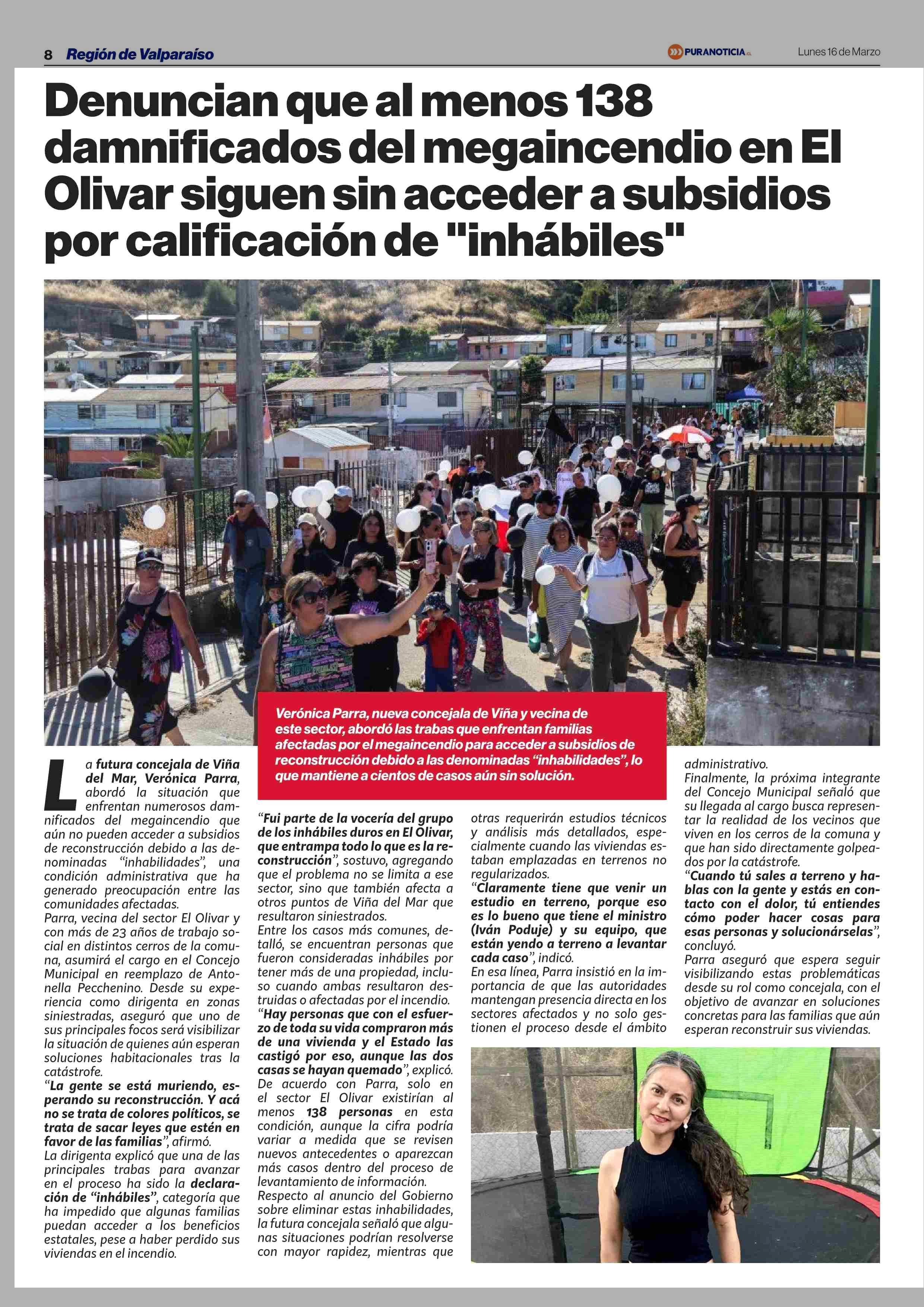 Título: Denuncian que al menos 138 damnificados del megaincendio en El Olivar siguen sin acceder a subsidios por calificación de' “Inhábiles”