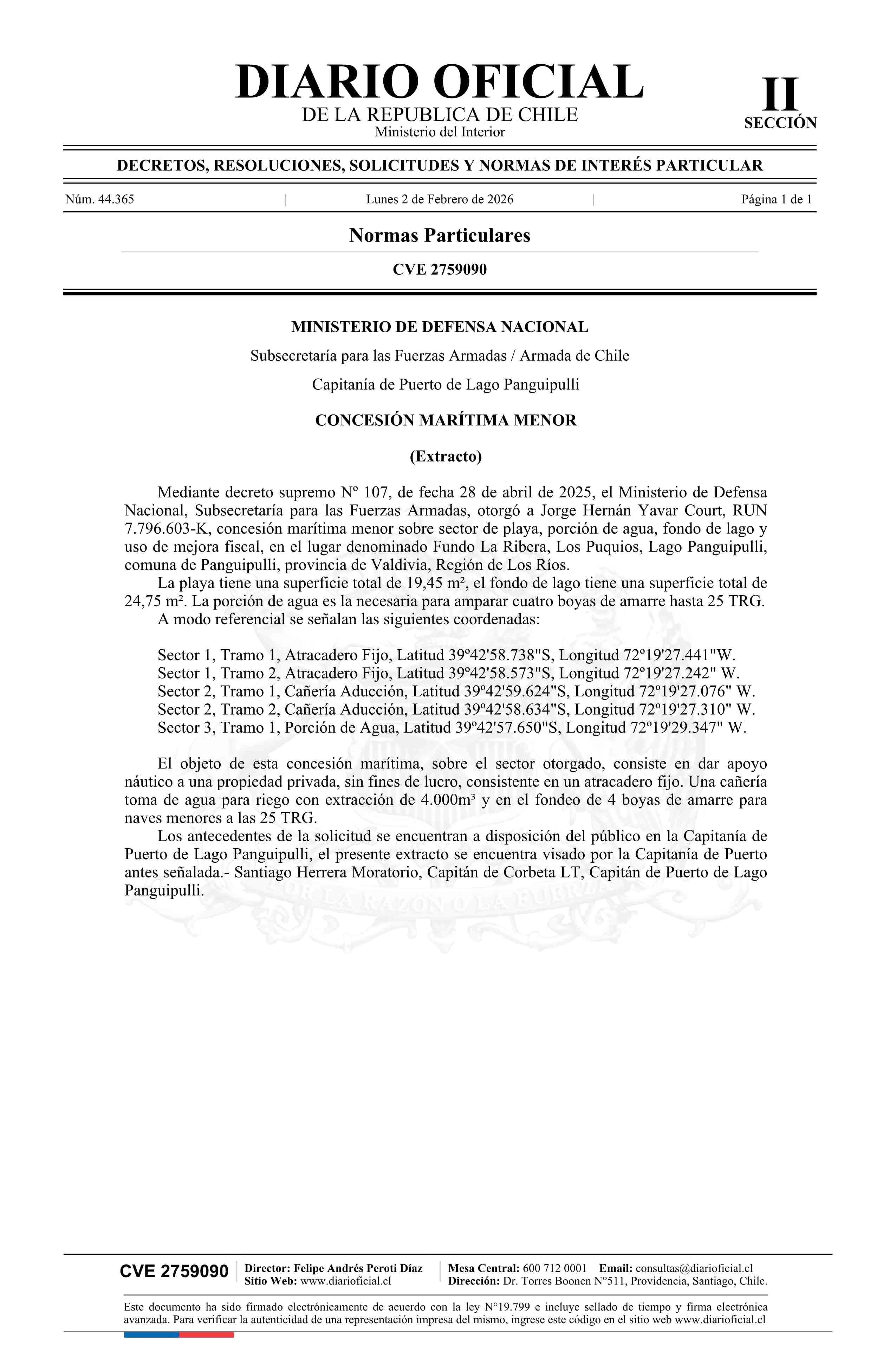 | Título: | Extracto de decreto número 107, de 2025.- Otorga concesión marítima menor |