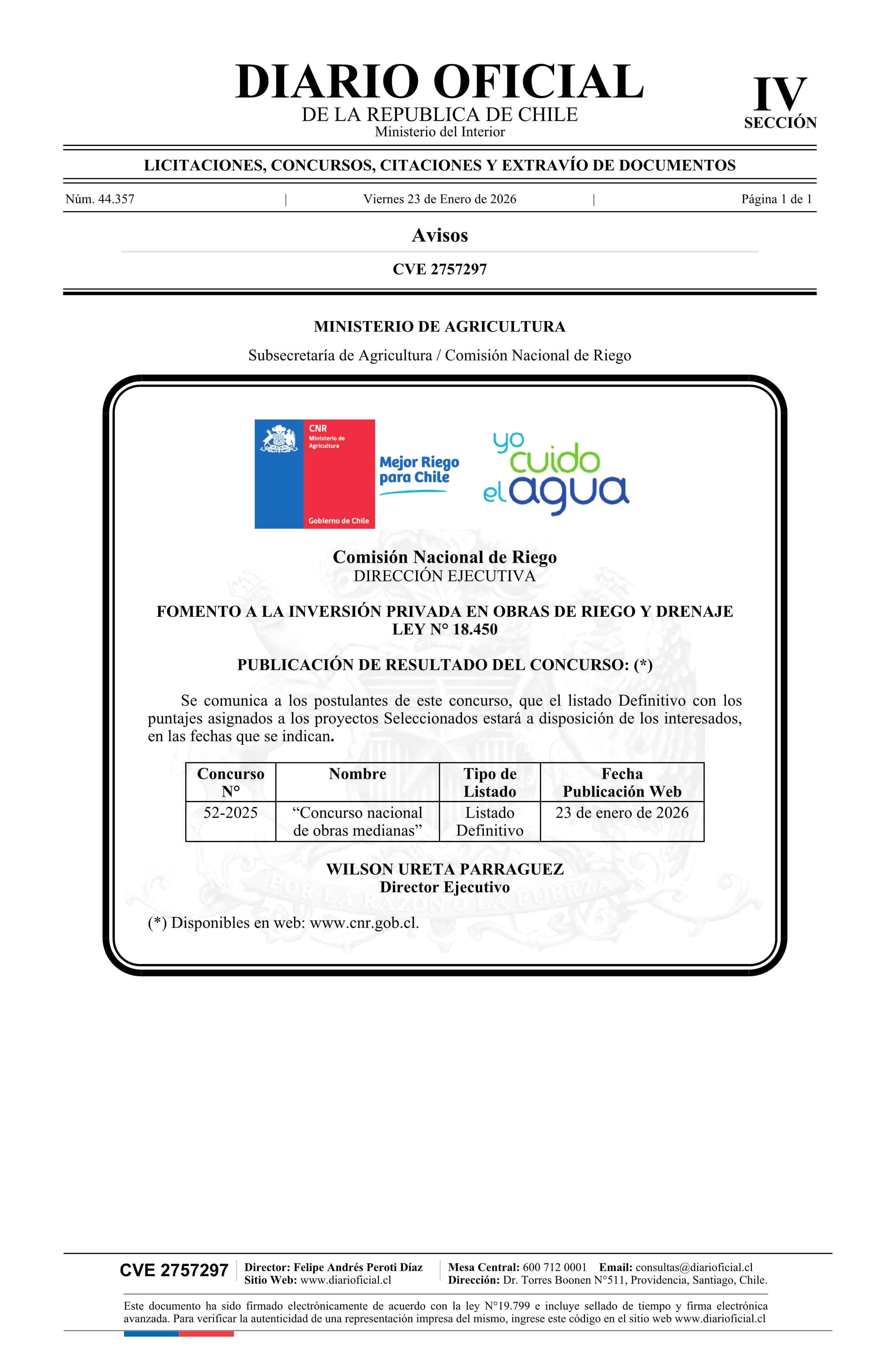 AVISO LICITACIONES: Fomento a la inversión privada en obras de riego y drenaje ley N° 18.450 23-01-2026 Diario Oficial Edición Electrónica |