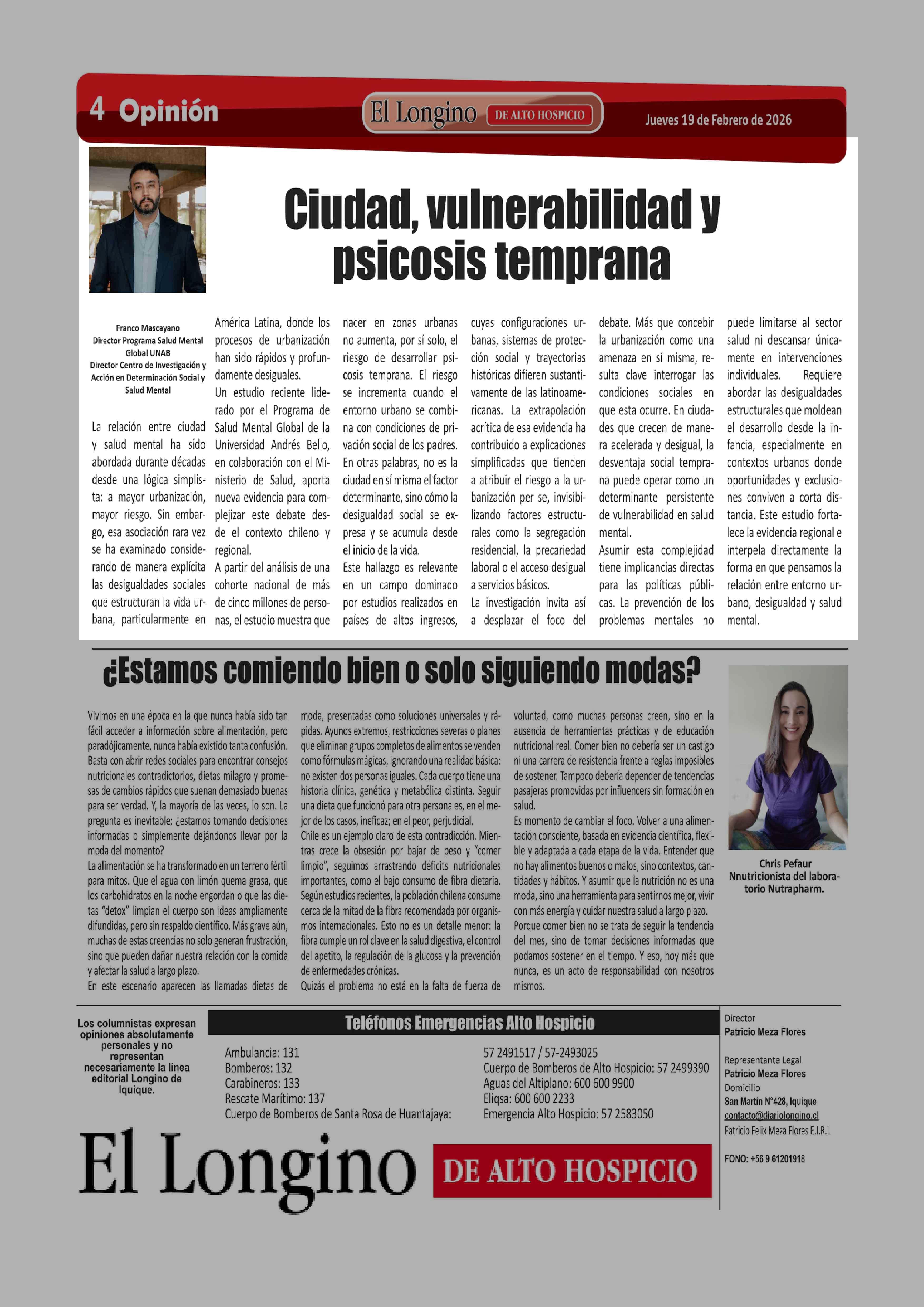 Columnas de Opinión: Ciudad, vulnerabilidad y psicosis temprana 19-02-2026 El Longino |