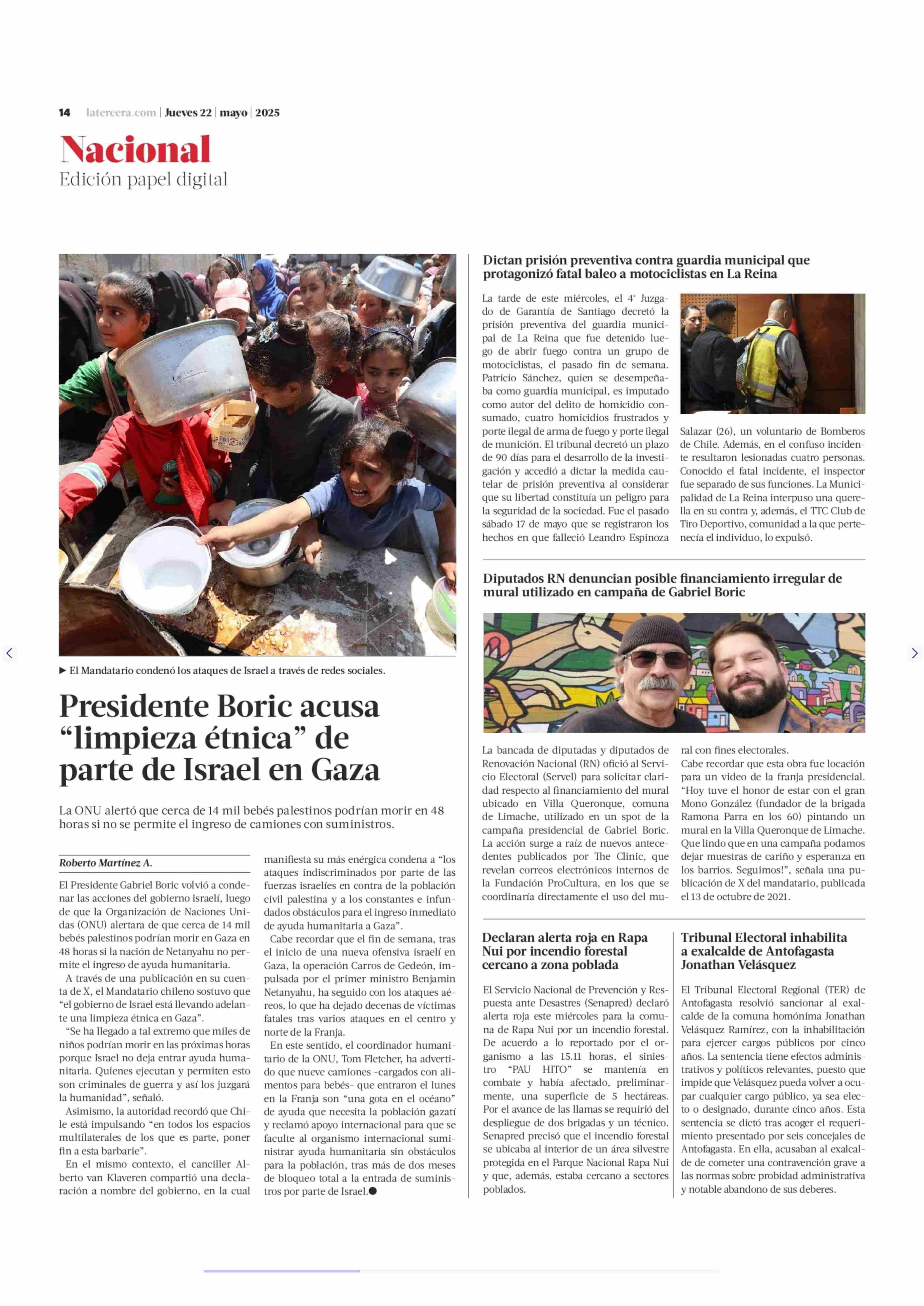 Presidente Boric acusa “limpieza étnica” de parte de Israel en Gaza 22-05-2025 La Tercera |