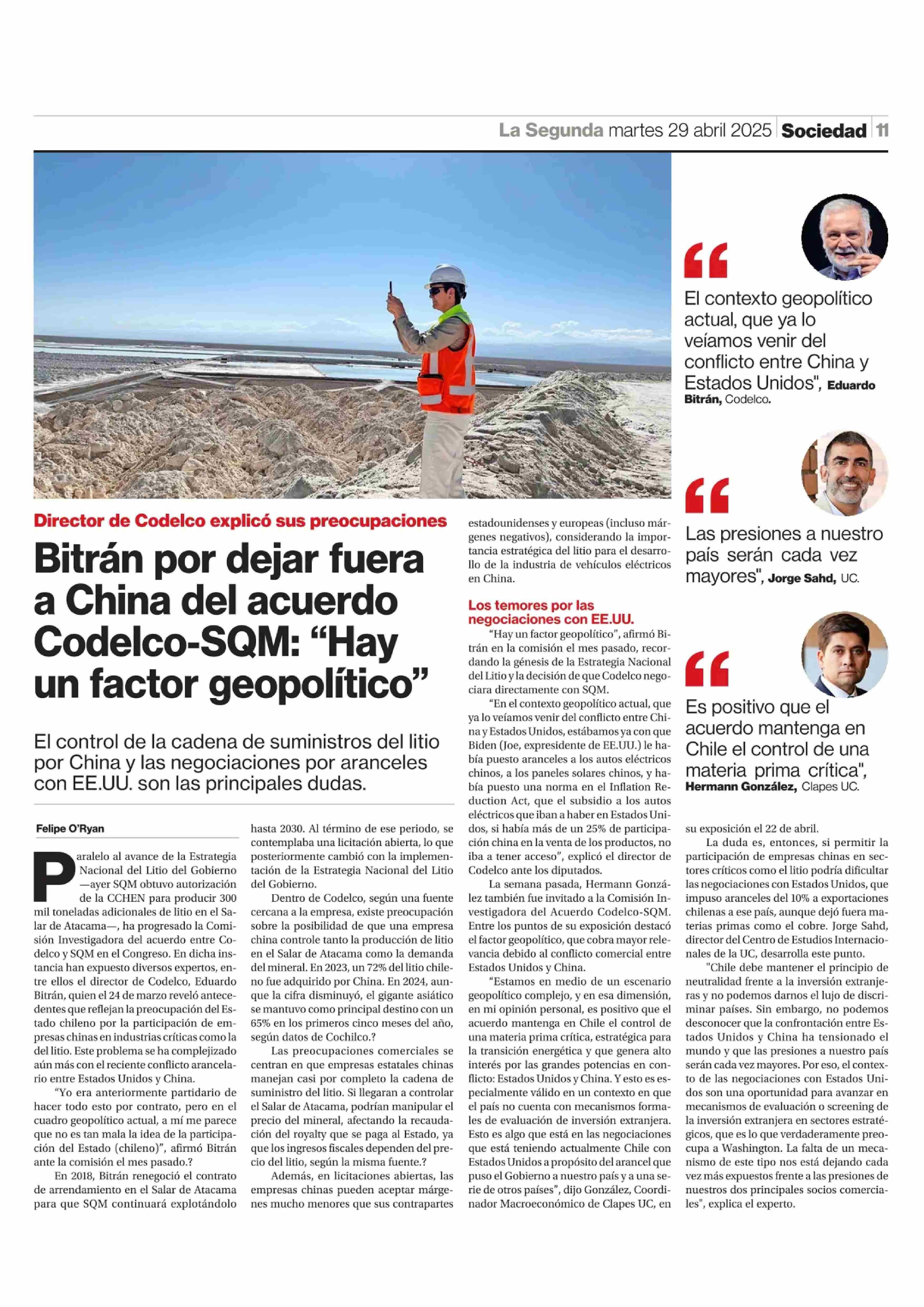 Bitrán por dejar fuera a China del acuerdo Codelco-SQM: “Hay un factor geopolítico” 29-04-2025 La Segunda |