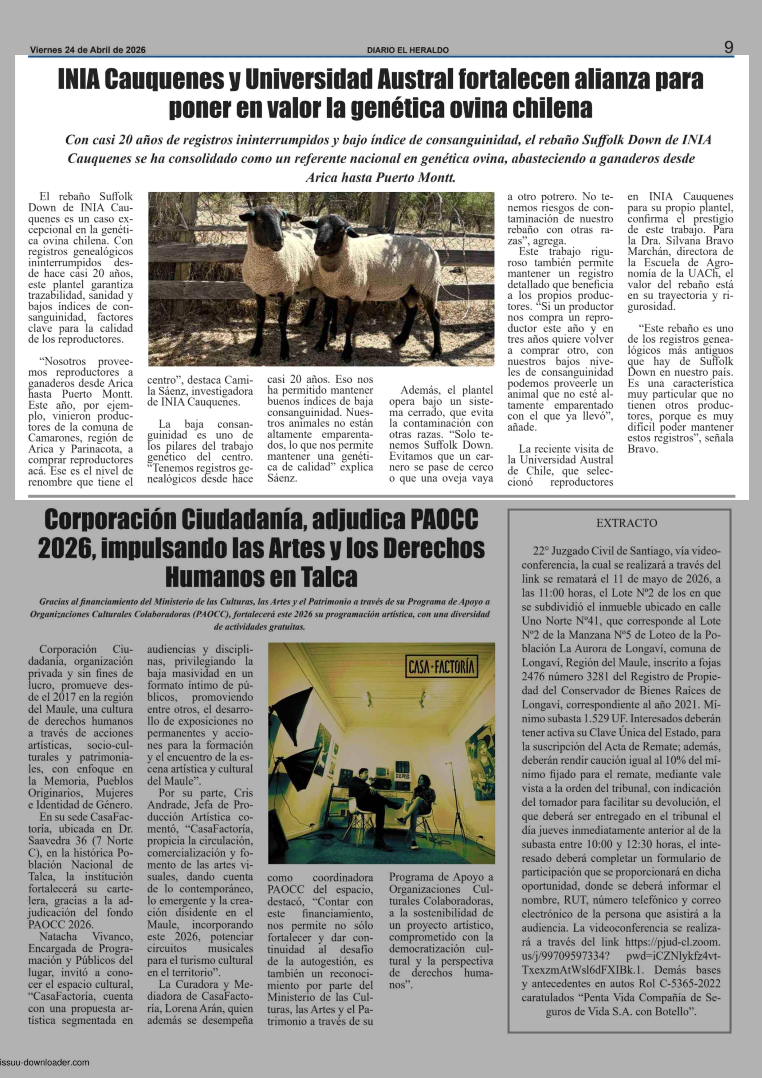 INIA Cauquenes y Universidad Austral fortalecen alianza para poner en valor la genética ovina chilena 24-04-2026 El Heraldo |