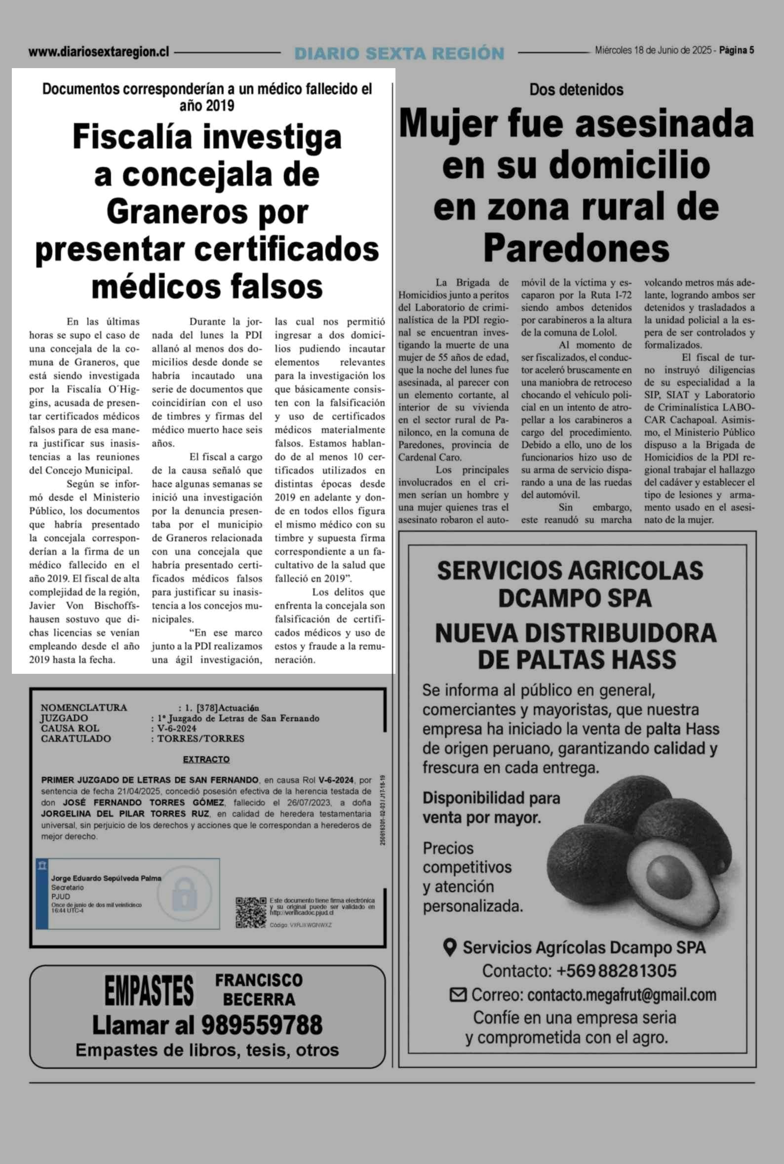 Fiscalía investiga a concejala de Graneros por presentar certificados médicos falsos 18-06-2025 Diario VI Región |