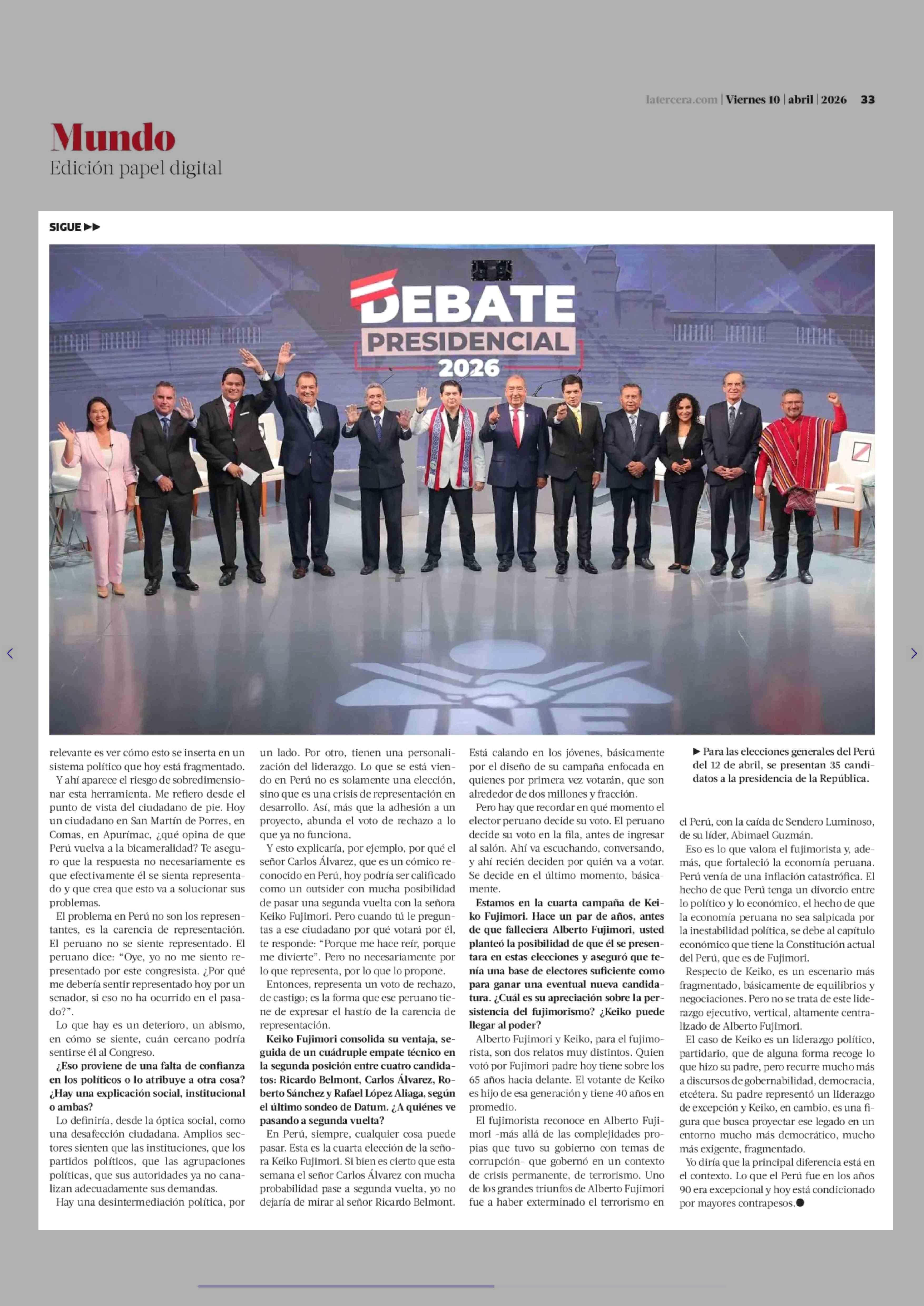 Carlos Escaffi, analista internacional: "El retorno de la bicameralidad no resuelve por sí sola la crisis de representación que hay en Perú" 10-04-2026 La Tercera |