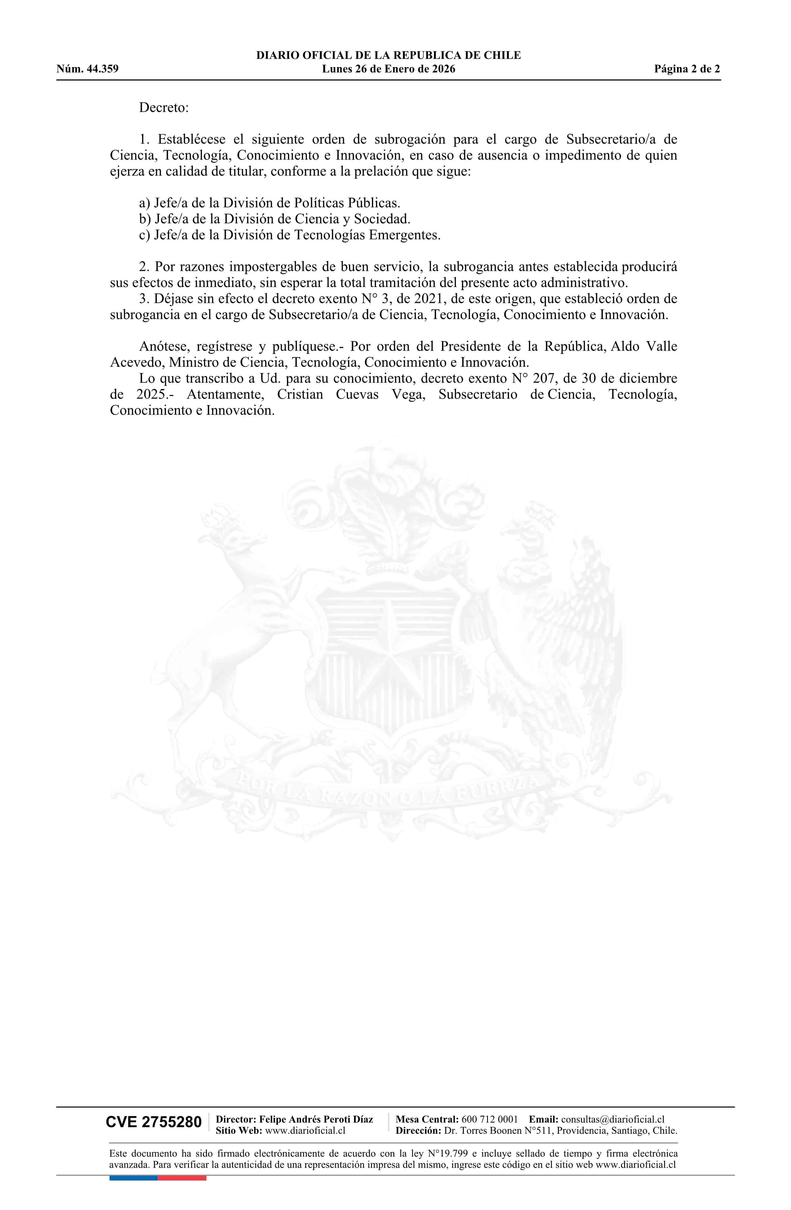 Título: Decreto exento número 207, de 2025.- Establece nuevo orden de subrogación en el cargo de Subsecretario/a de Ciencia, Tecnología, Conocimiento e Innovación y deja sin efecto decreto N° 3 exento, de 2021