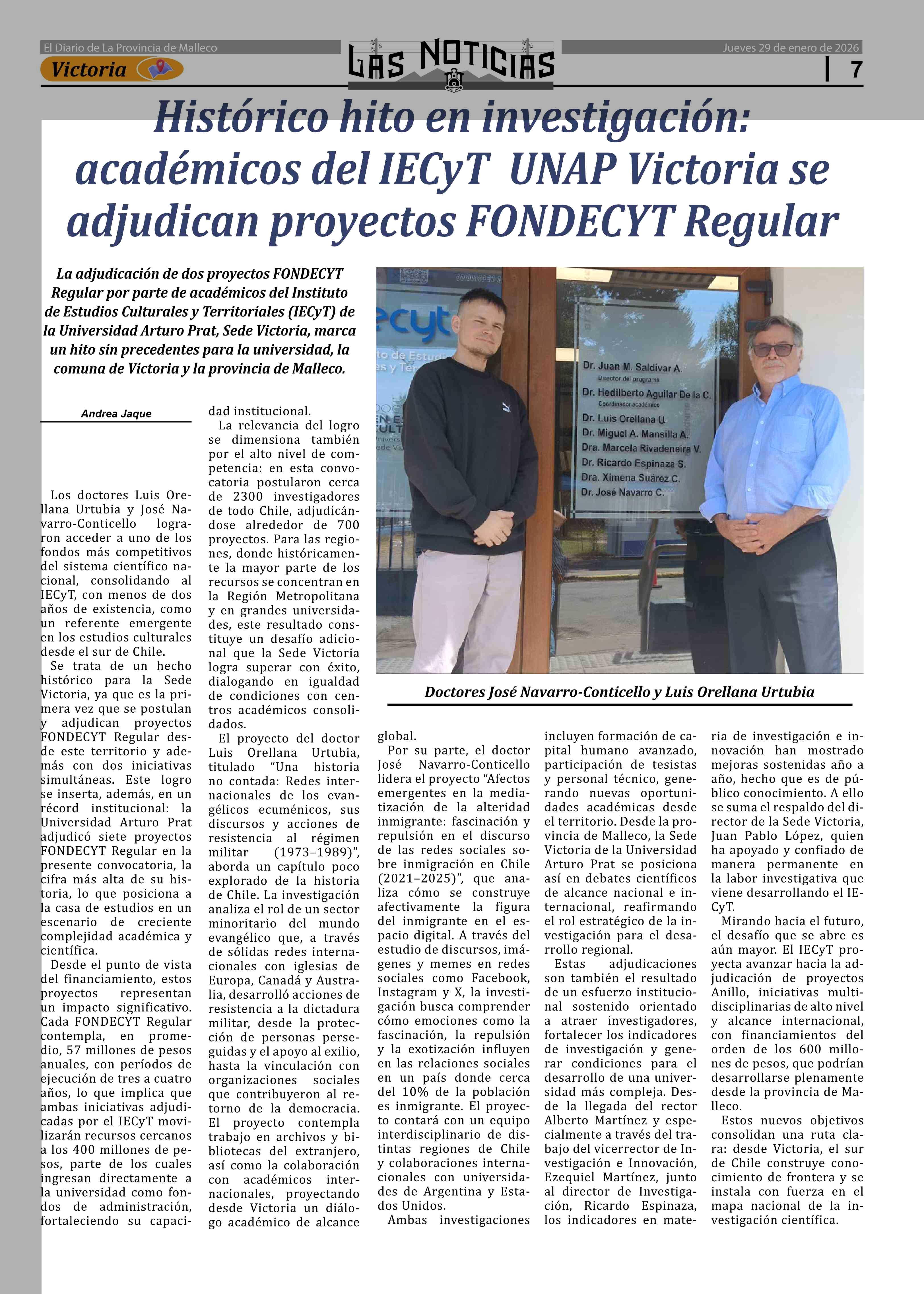 Título: Histórico hito en investigación: académicos del IECyT UNAP Victoria se adjudican proyectos FONDECYT Regular