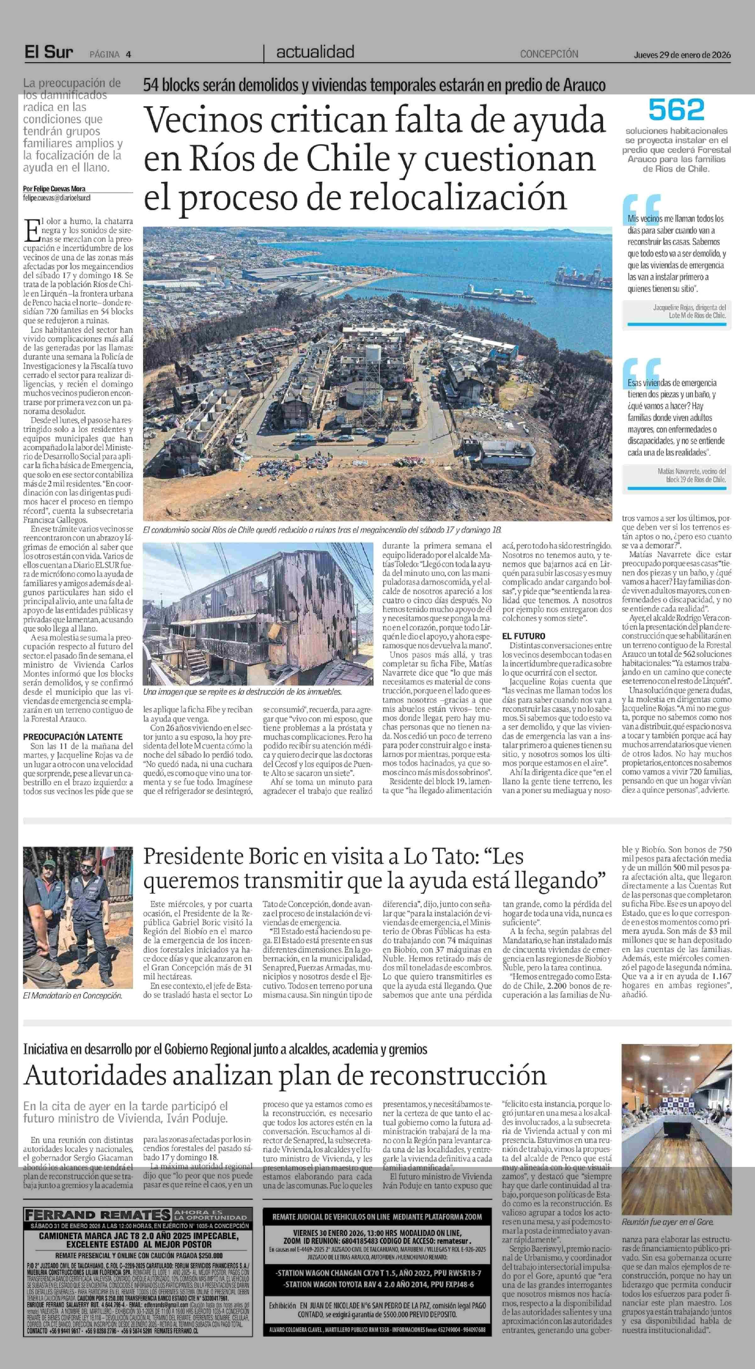 Vecinos critican falta de ayuda en Ríos de Chile y cuestionan el proceso de relocalización 29-01-2026 El Sur |