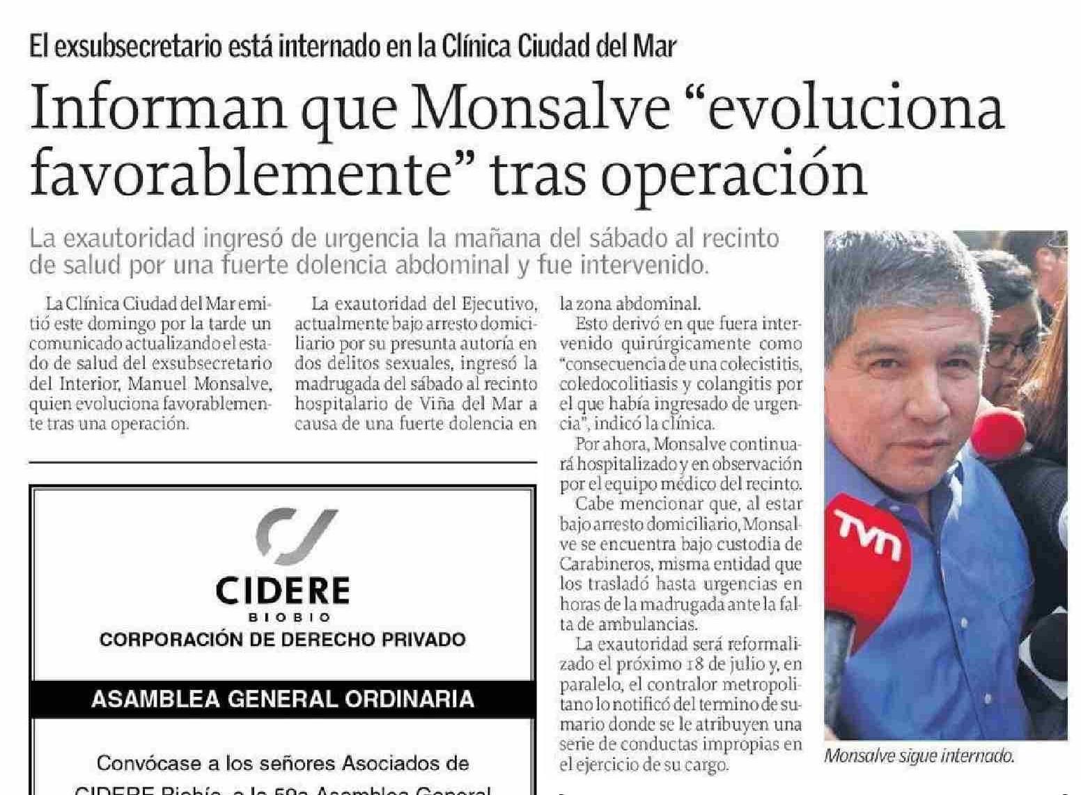 Informan que Monsalve “evoluciona favorablemente” tras operación 16-06-2025 El Sur |