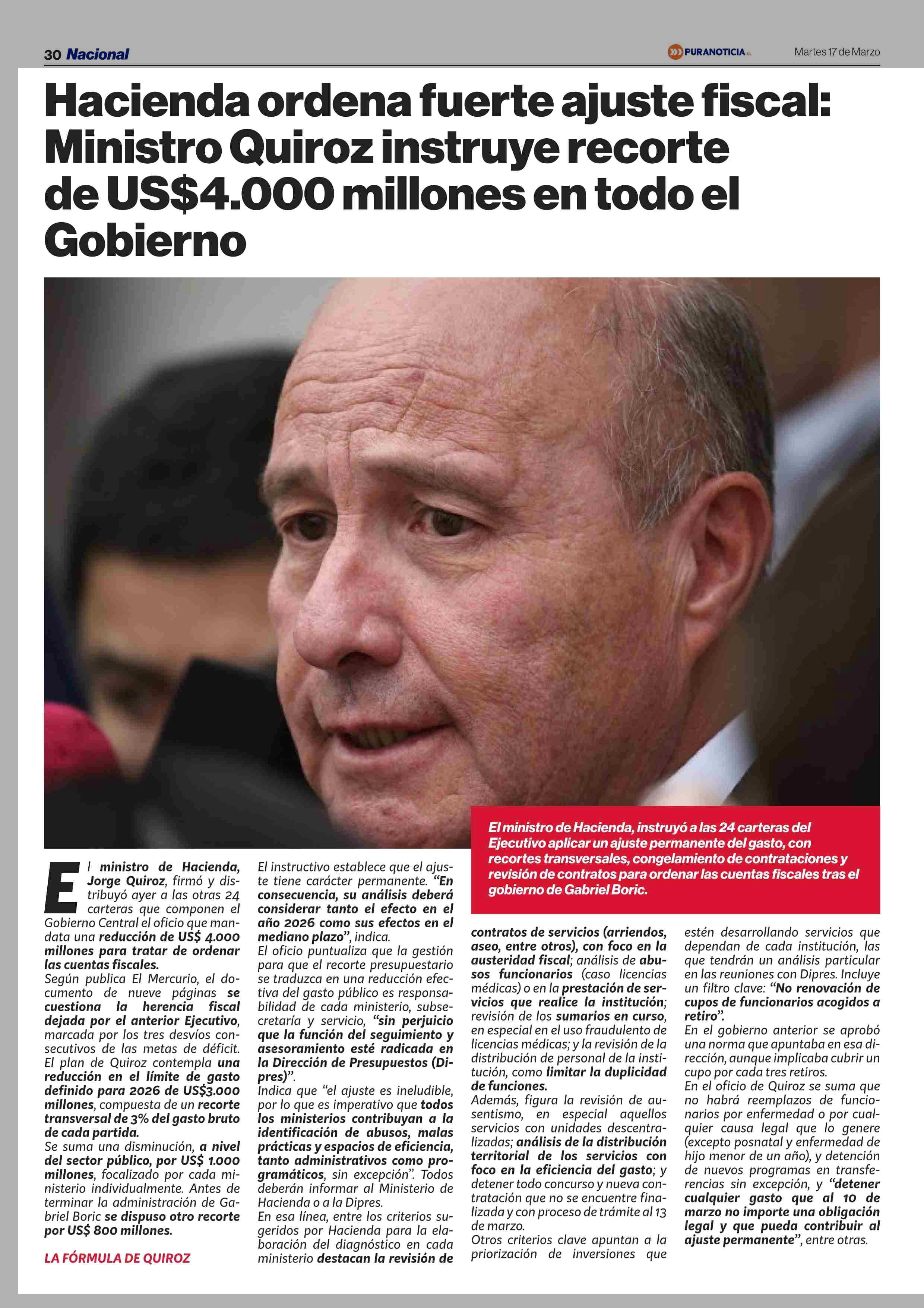 Hacienda ordena fuerte ajuste fiscal: Ministro Quiroz instruye recorte de US$4.000 millones en todo el Gobierno 17-03-2026 Puranoticia.cl |