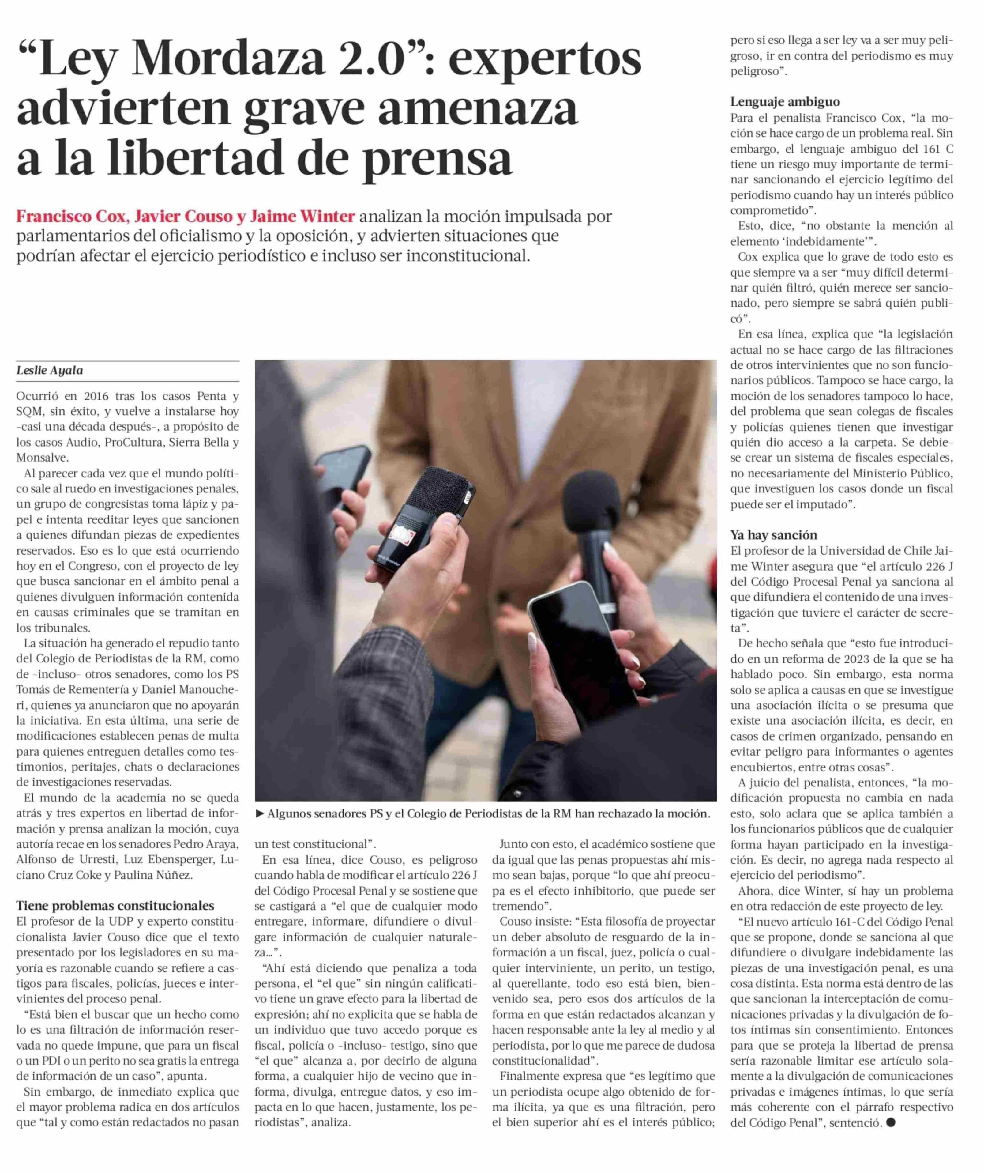 “Ley Mordaza 2.0”: expertos advierten grave amenaza a la libertad de prensa 13-06-2025 La Tercera |