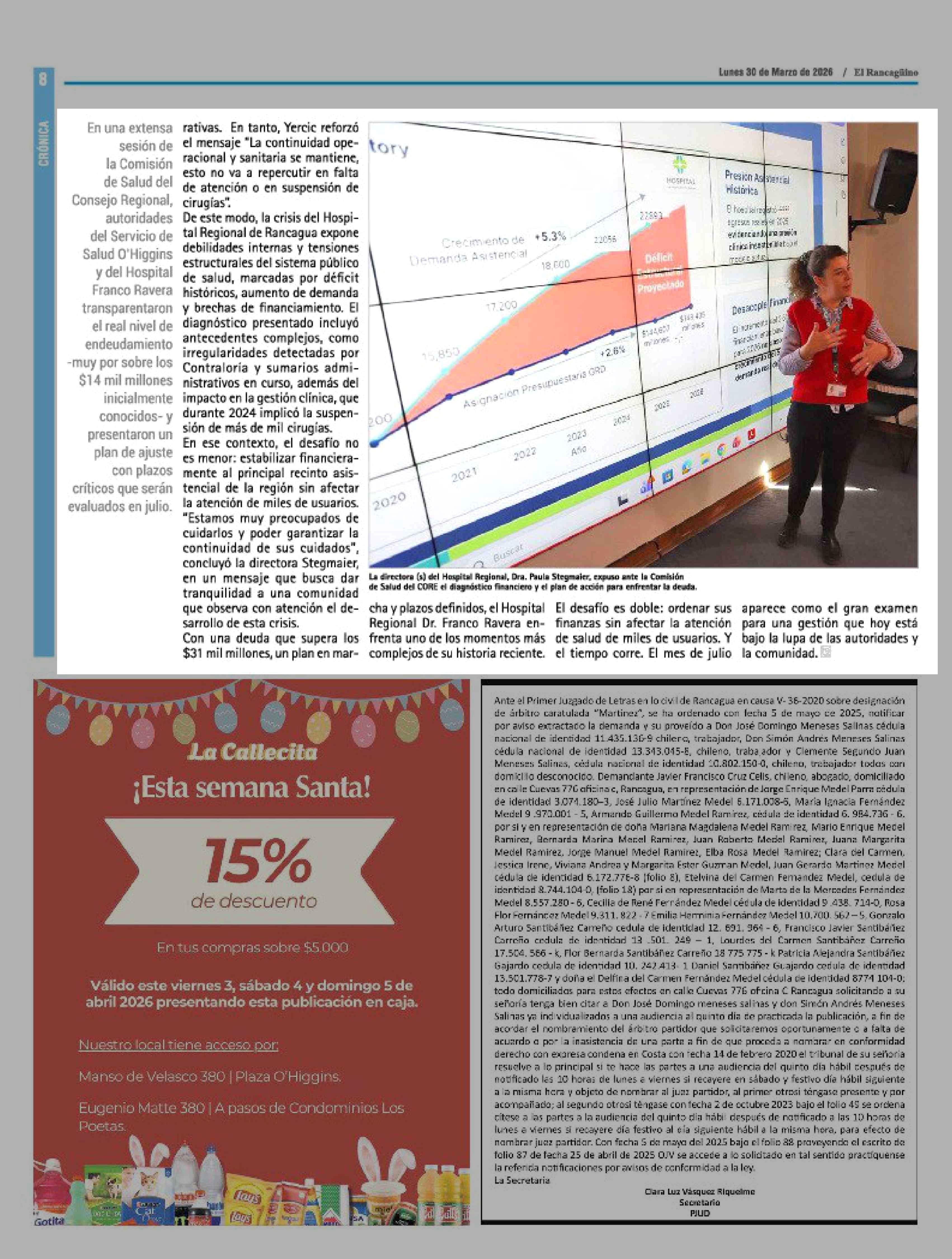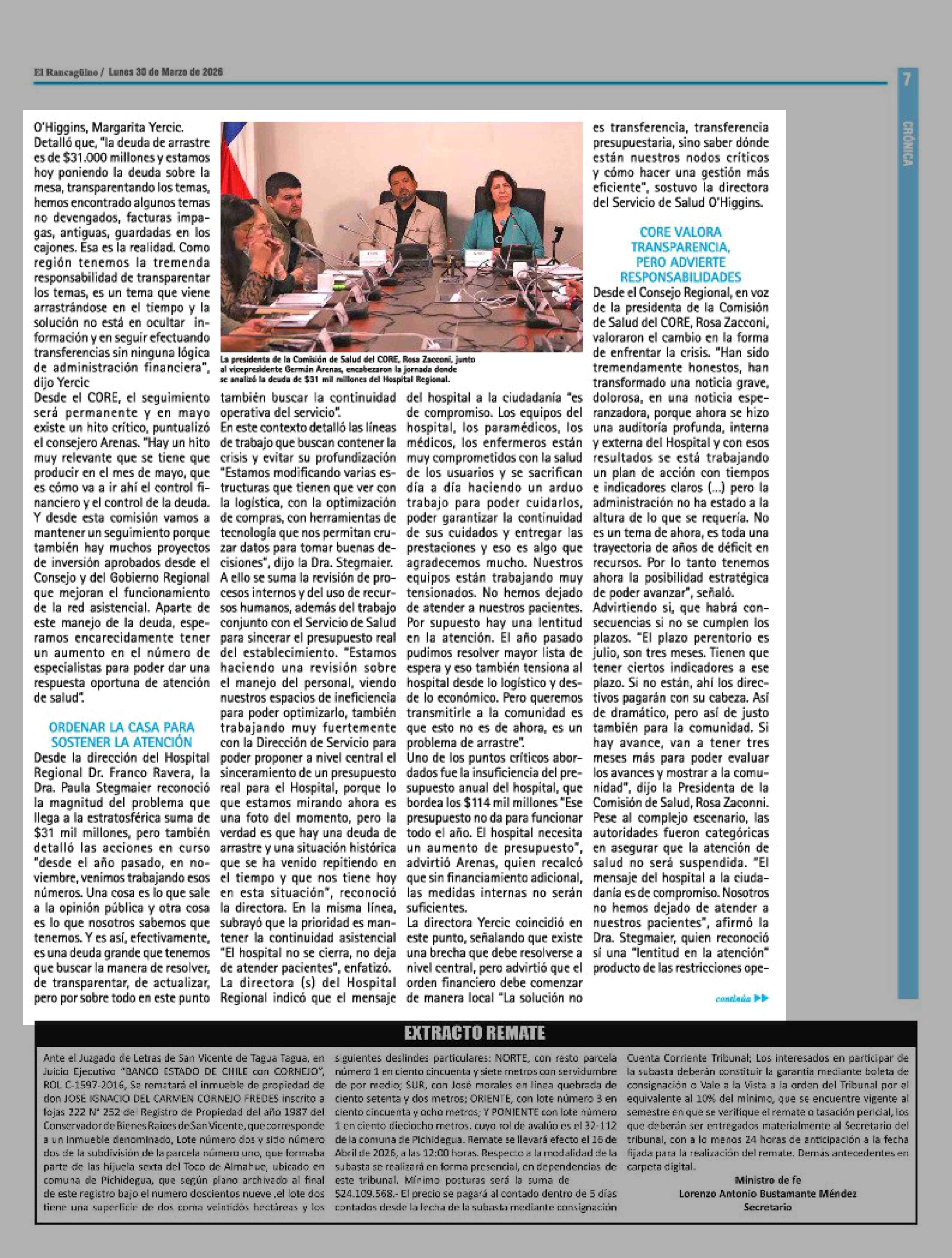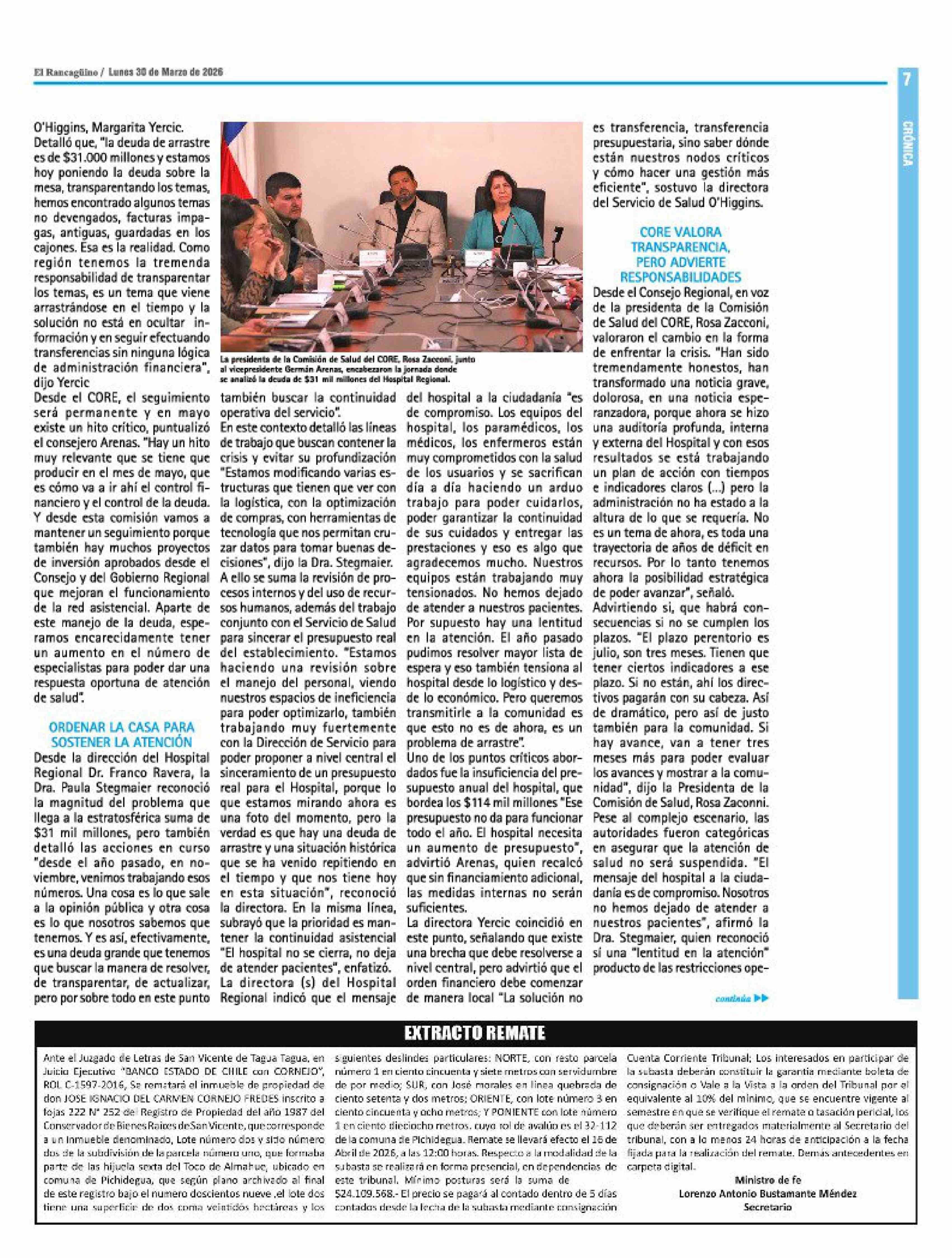 Hospital Regional Dr. Franco Ravera enfrenta deuda de $31 mil millones y CORE exige resultados en cuatro meses 30-03-2026 El Rancagüino |