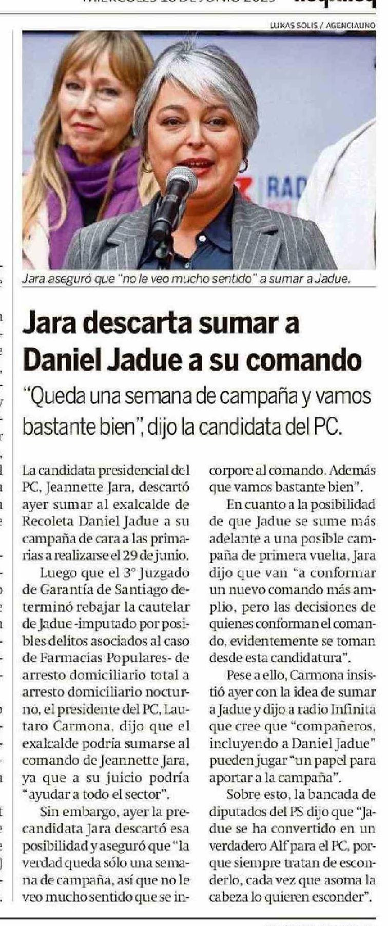 | Título: | Jara descarta sumar a Daniel Jadue a su comando |