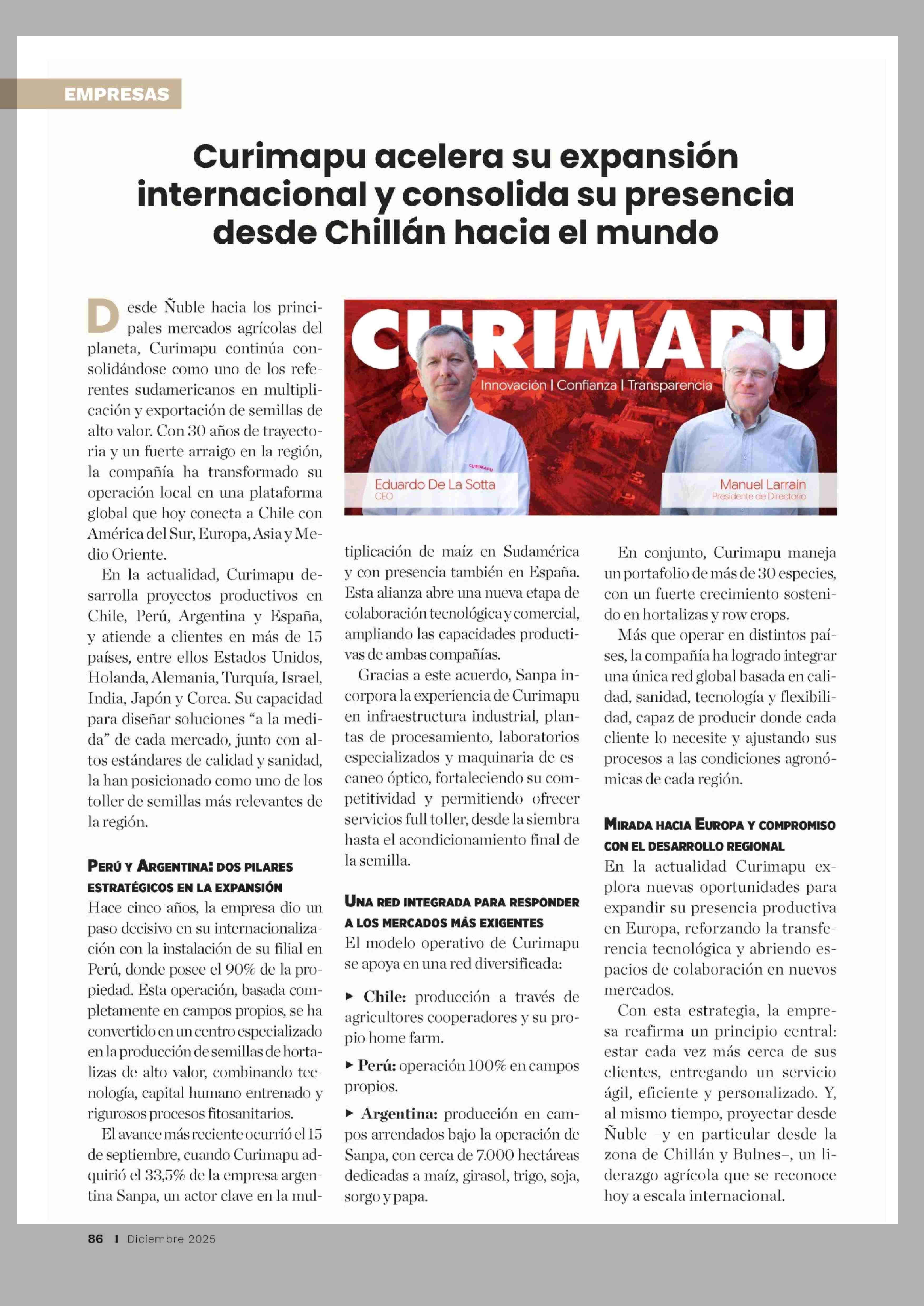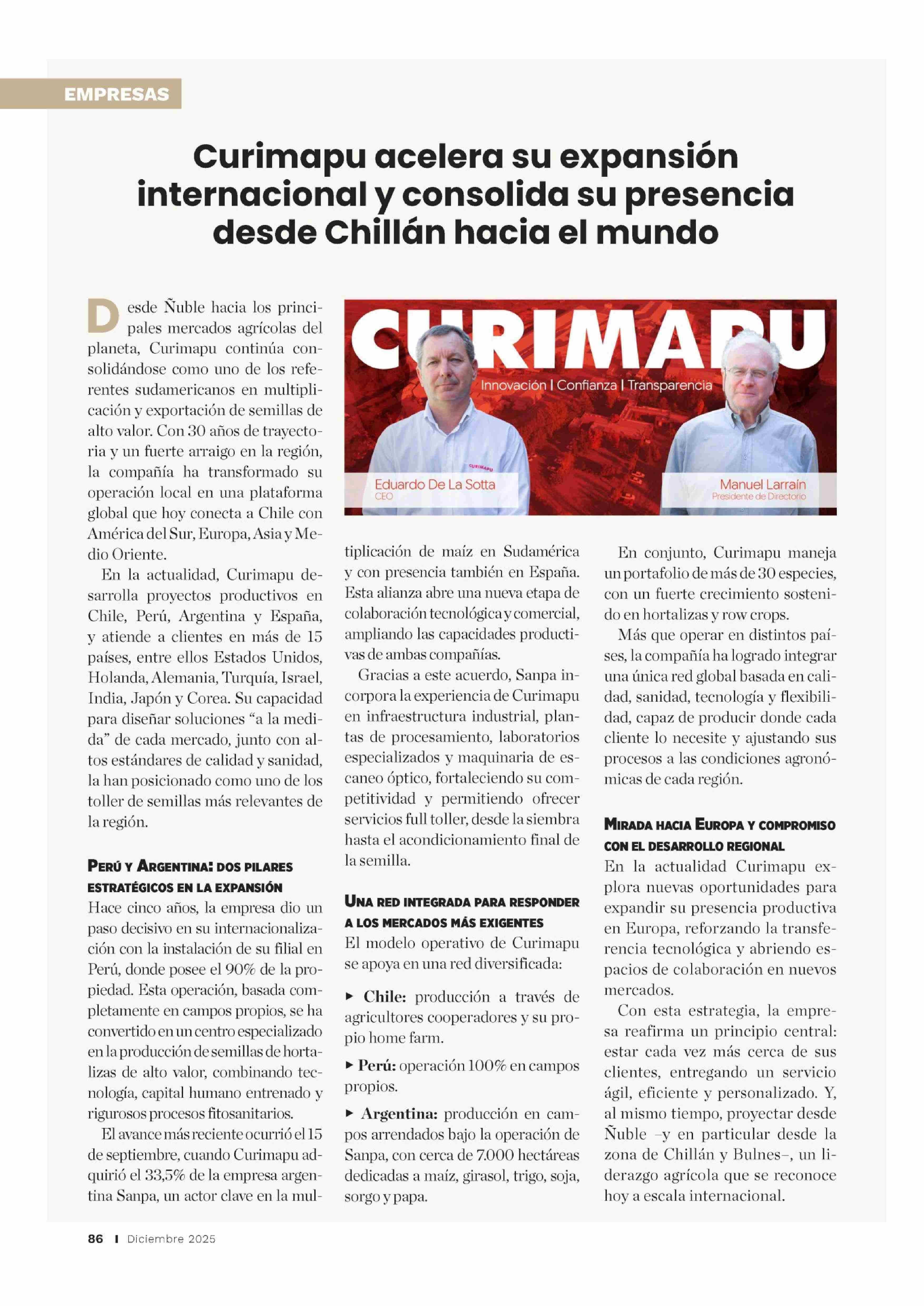 Curimapu acelera su expansión internacional y consolida su presencia desde Chillán hacia el mundo 20-01-2026 Revista Mundo Agro |