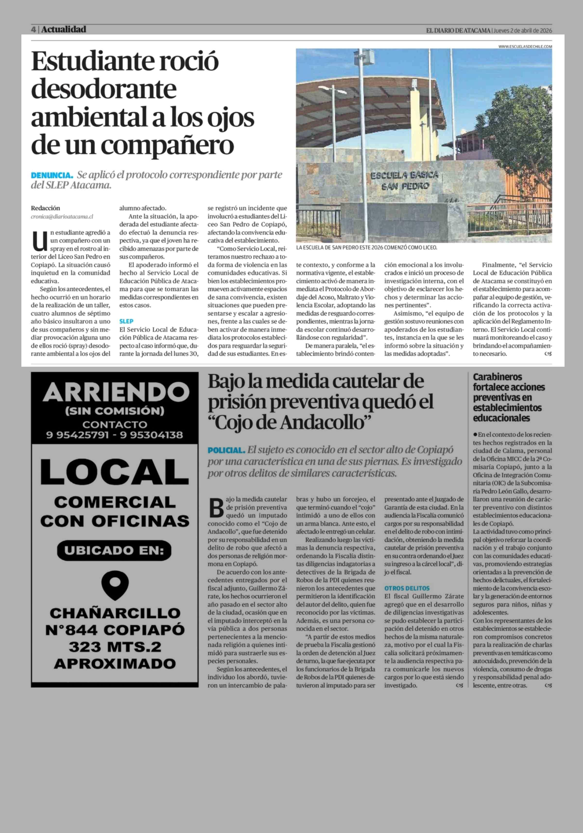 Estudiante roció desodorante ambiental a los ojos de un compañero 02-04-2026 El Diario de Atacama |