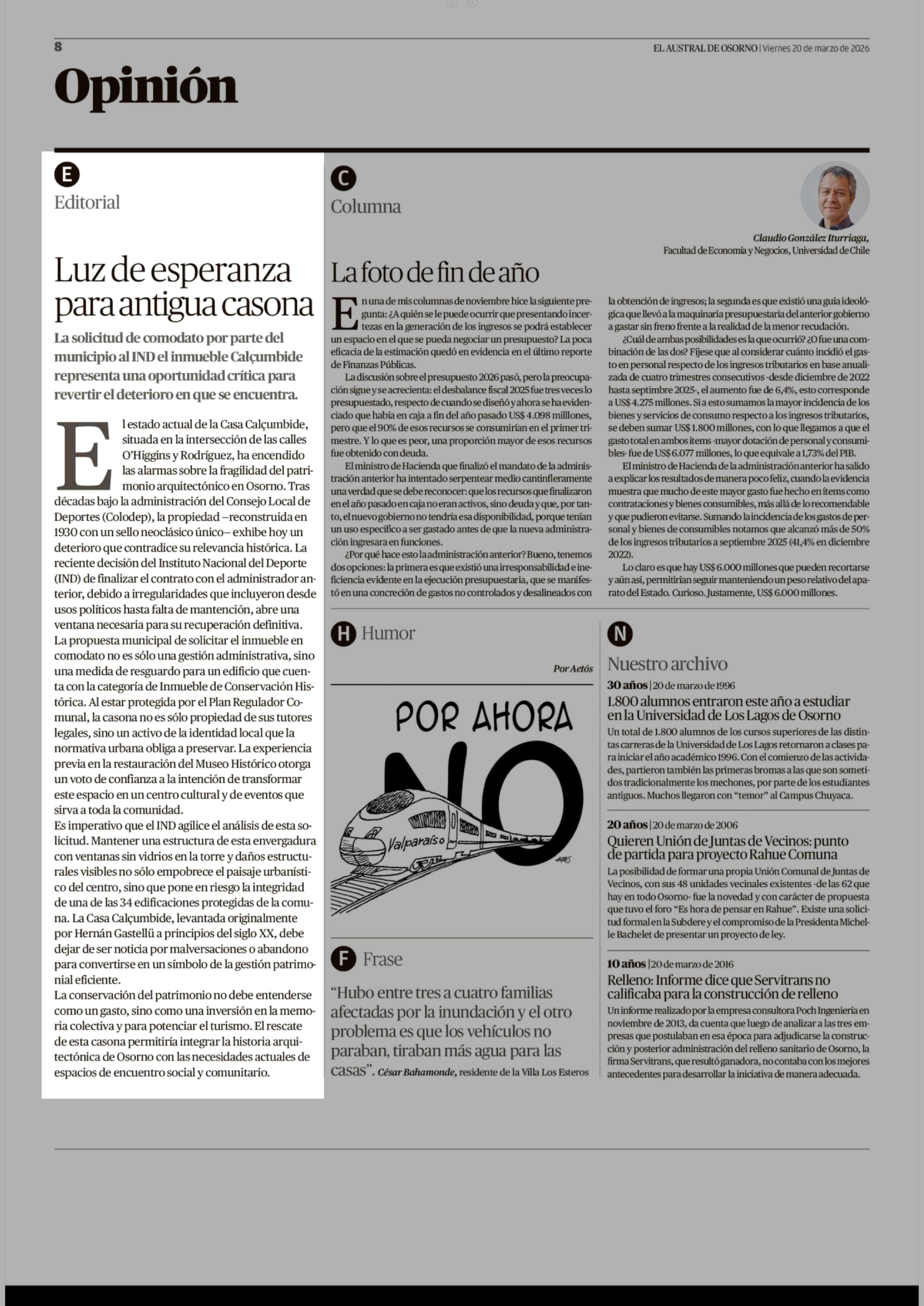 Editorial: Luz de esperanza para antigua casona 20-03-2026 El Austral de Osorno |