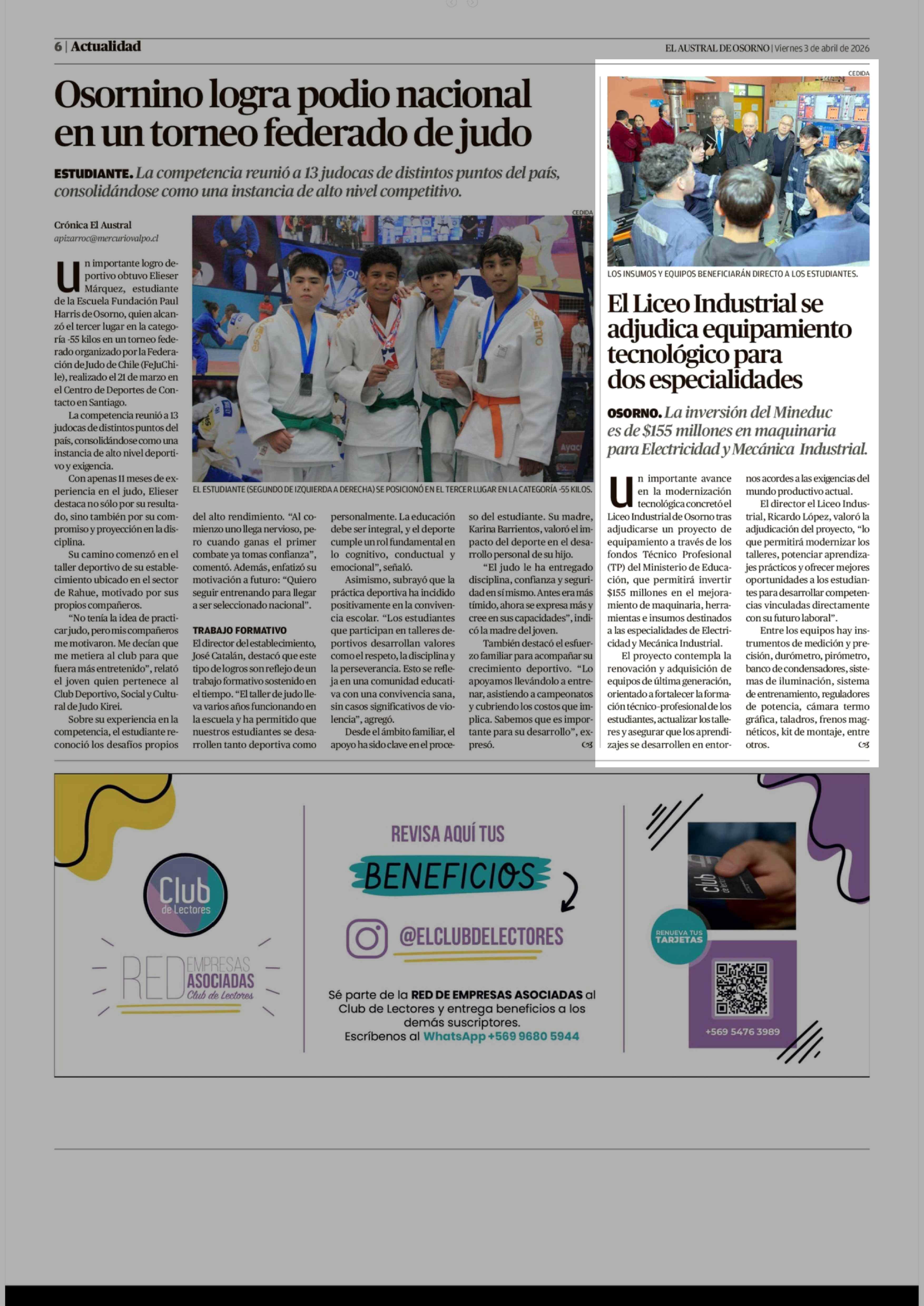 El Liceo Industrial se adjudica equipamiento tecnológico para dos especialidades 03-04-2026 El Austral de Osorno |