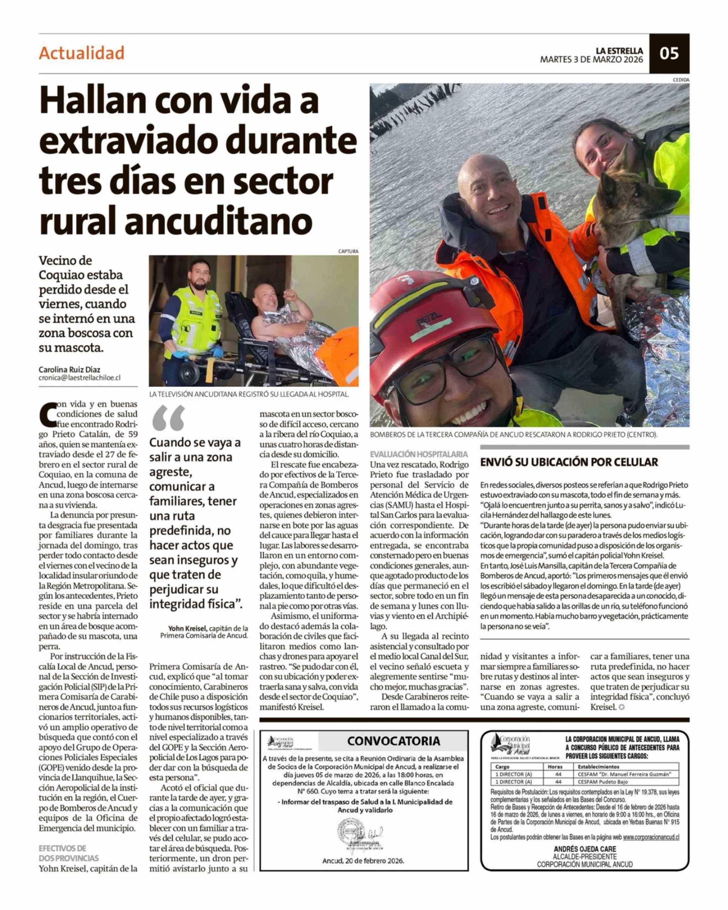 Hallan con vida a extraviado durante tres días en sector rural ancuditano 03-03-2026 La Estrella de Chiloé |