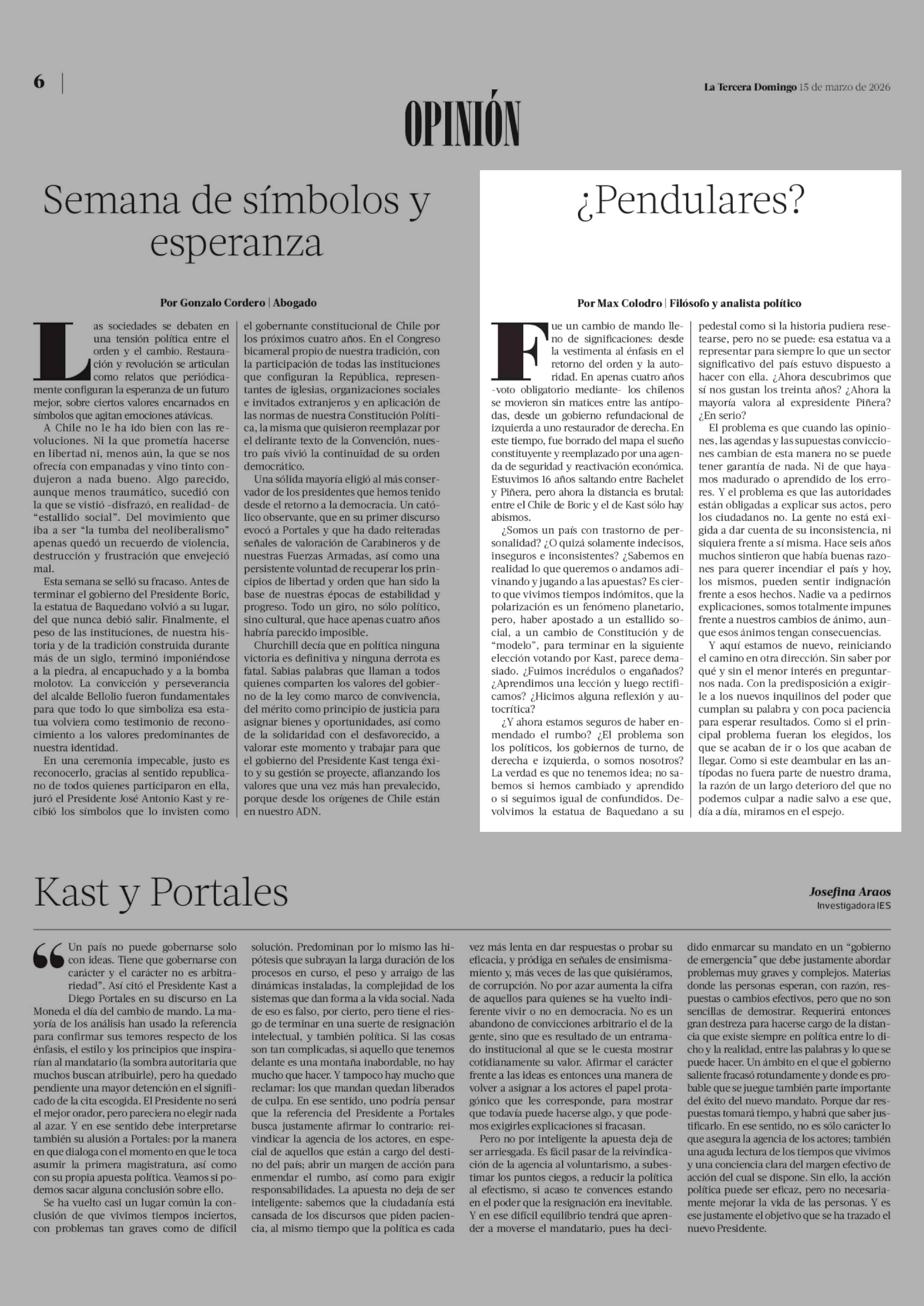 Columnas de Opinión: ¿Pendulares? 15-03-2026 La Tercera |