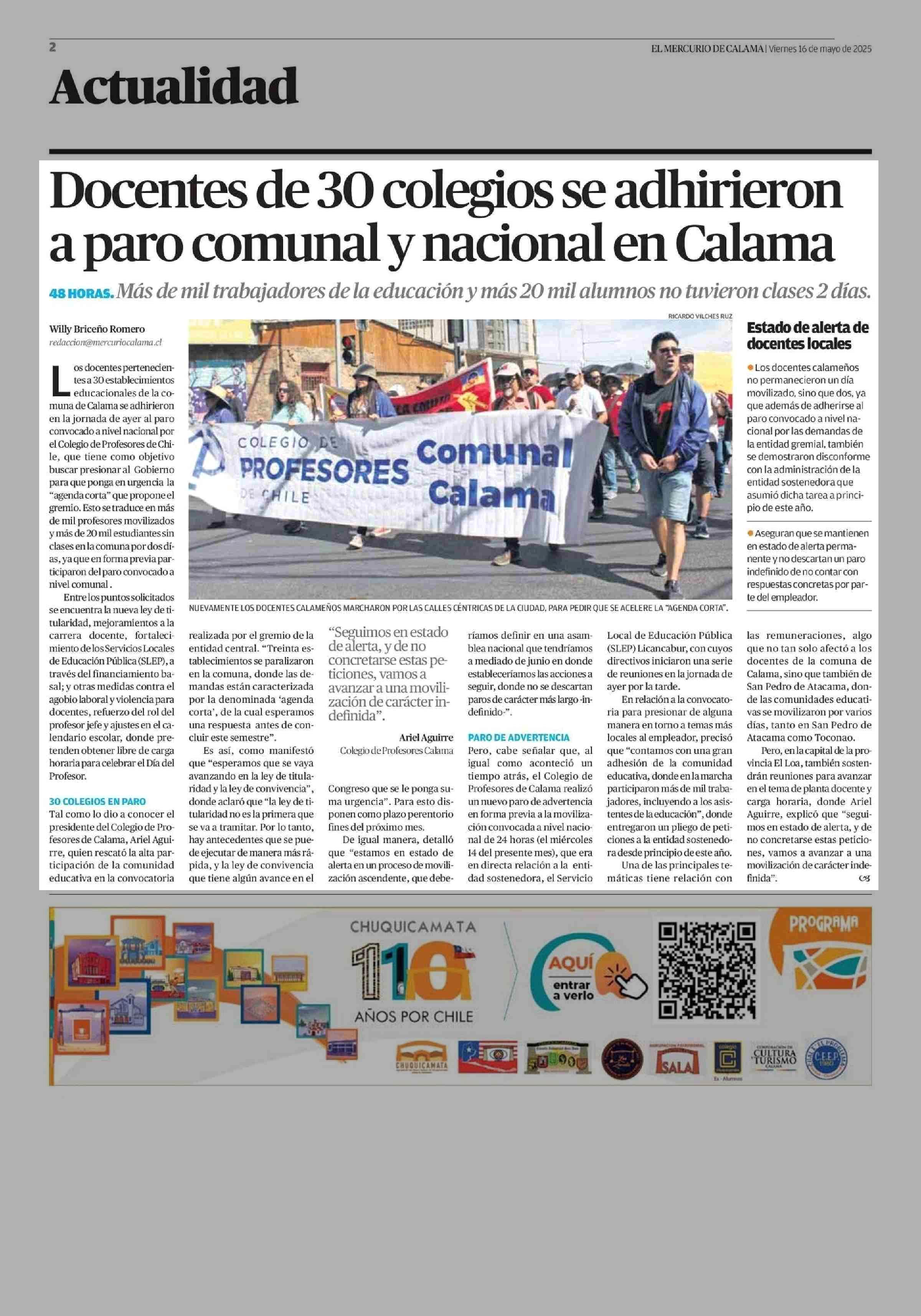 Docentes de 30 colegios se adhirieron a paro comunal y nacional en Calama 16-05-2025 El Mercurio de Calama |