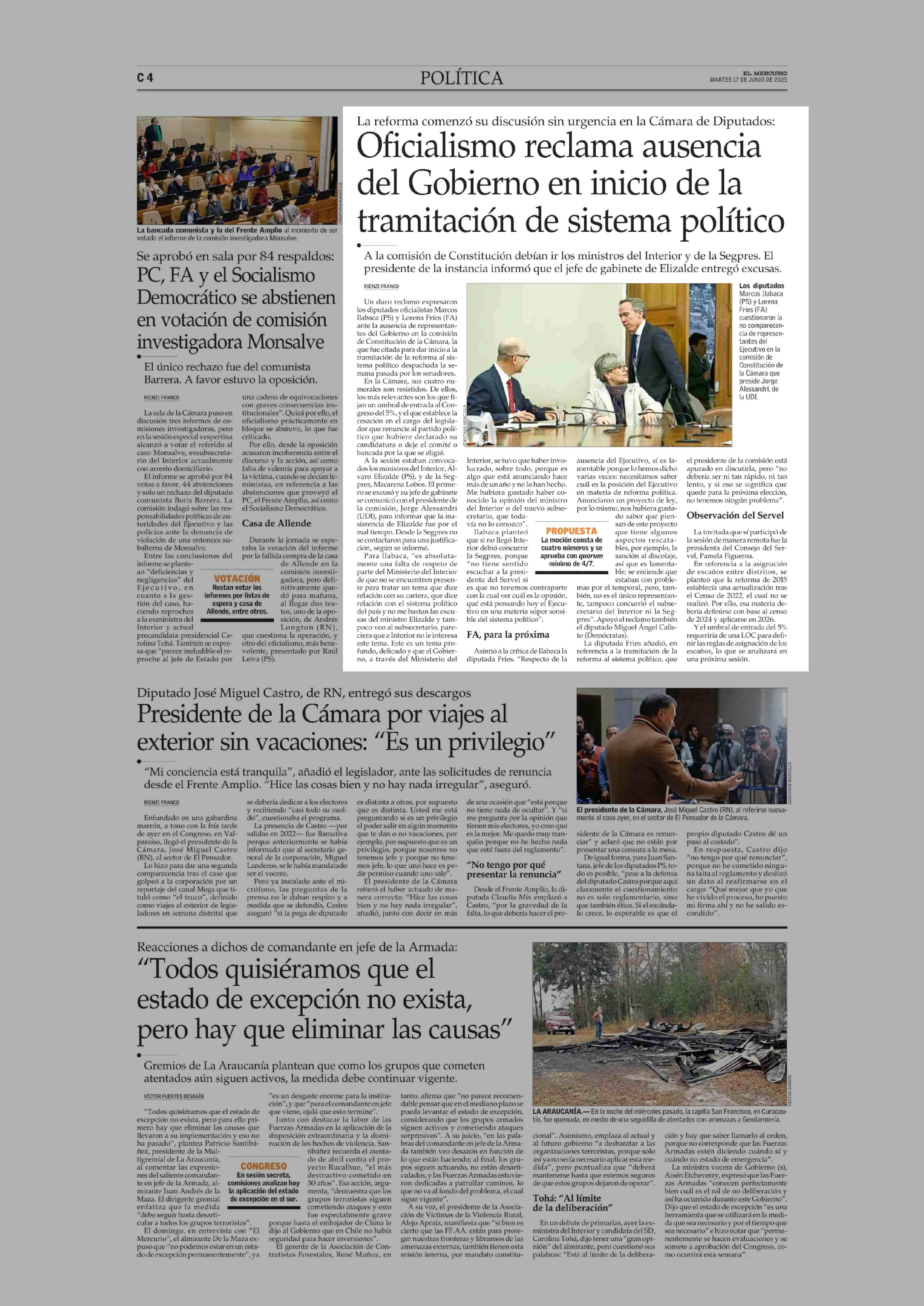 Oficialismo reclama ausencia del Gobierno en inicio de la tramitación de sistema político 17-06-2025 El Mercurio |