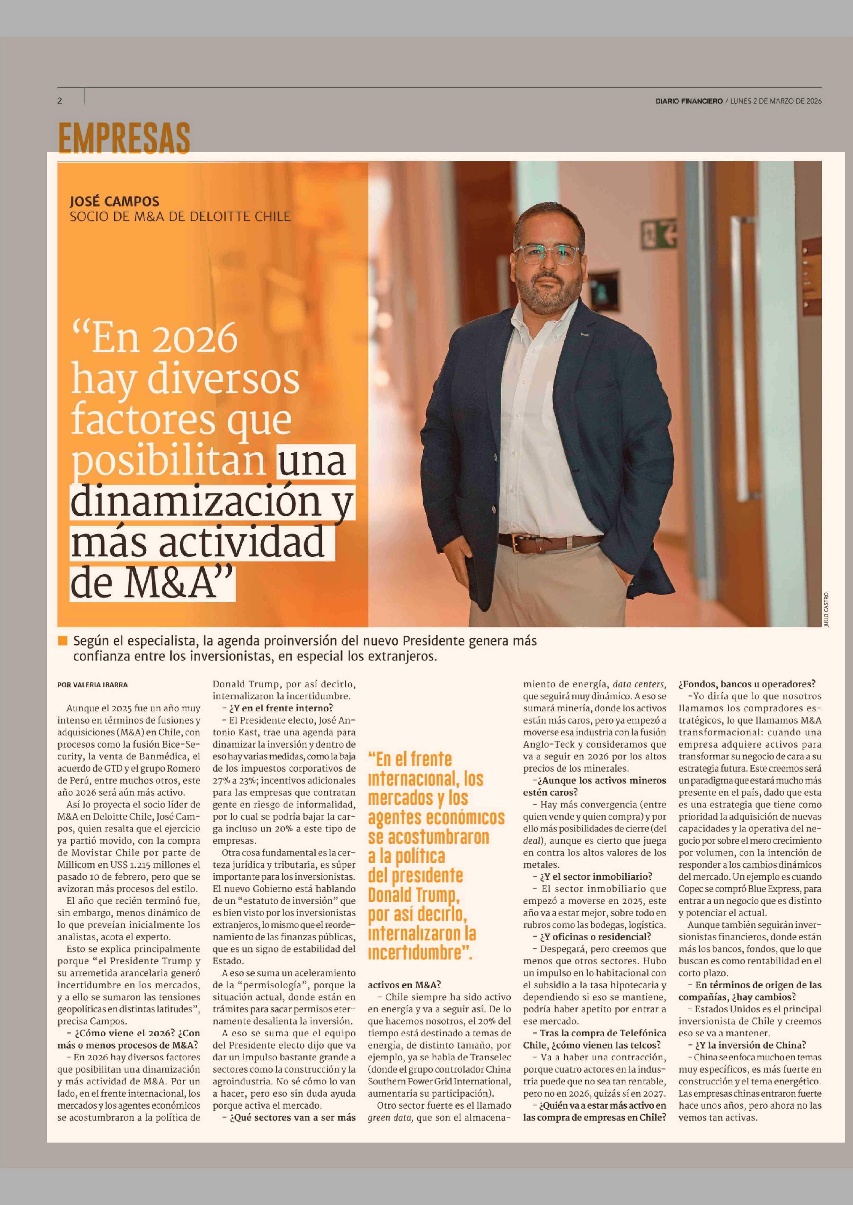 "En 2026 hay diversos factores que posibilitan una dinamización y más actividad de M&A" 02-03-2026 Diario Financiero |