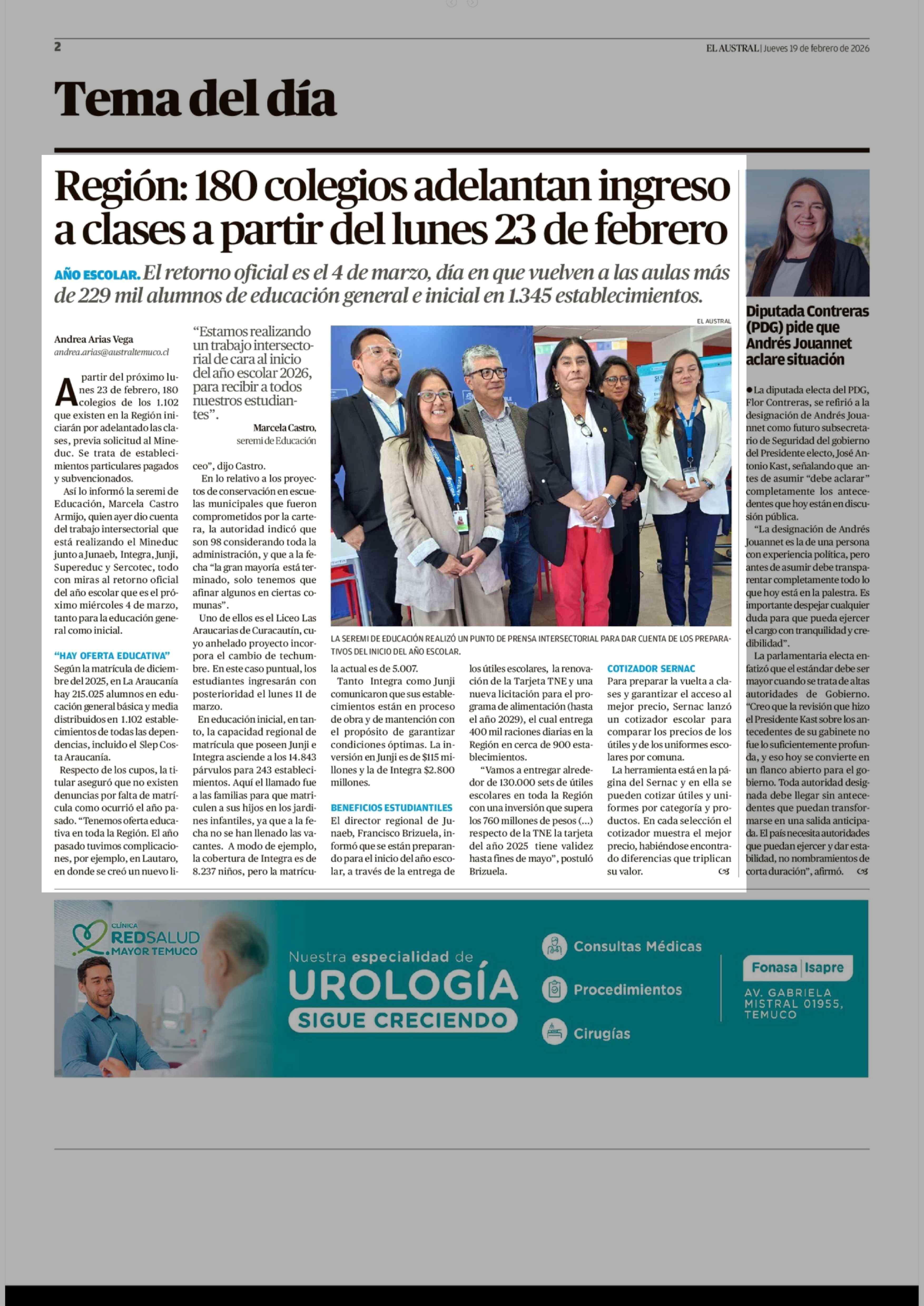 Región: 180 colegios adelantan ingreso a clases a partir del lunes 23 de febrero 19-02-2026 El Austral de la Araucanía |