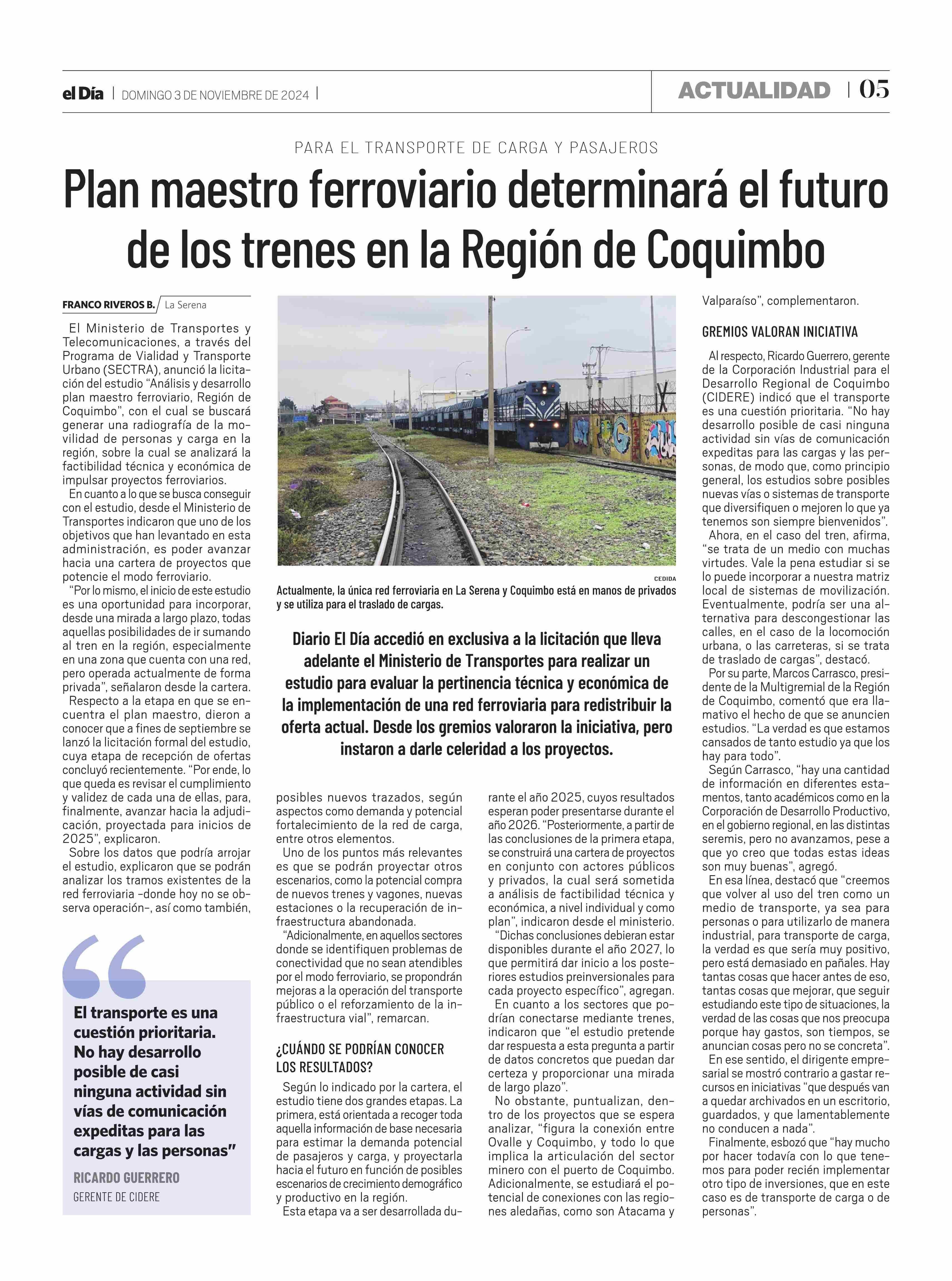 Plan maestro ferroviario determinará el futuro de los trenes en la Región de Coquimbo 03-11-2024 El Día |