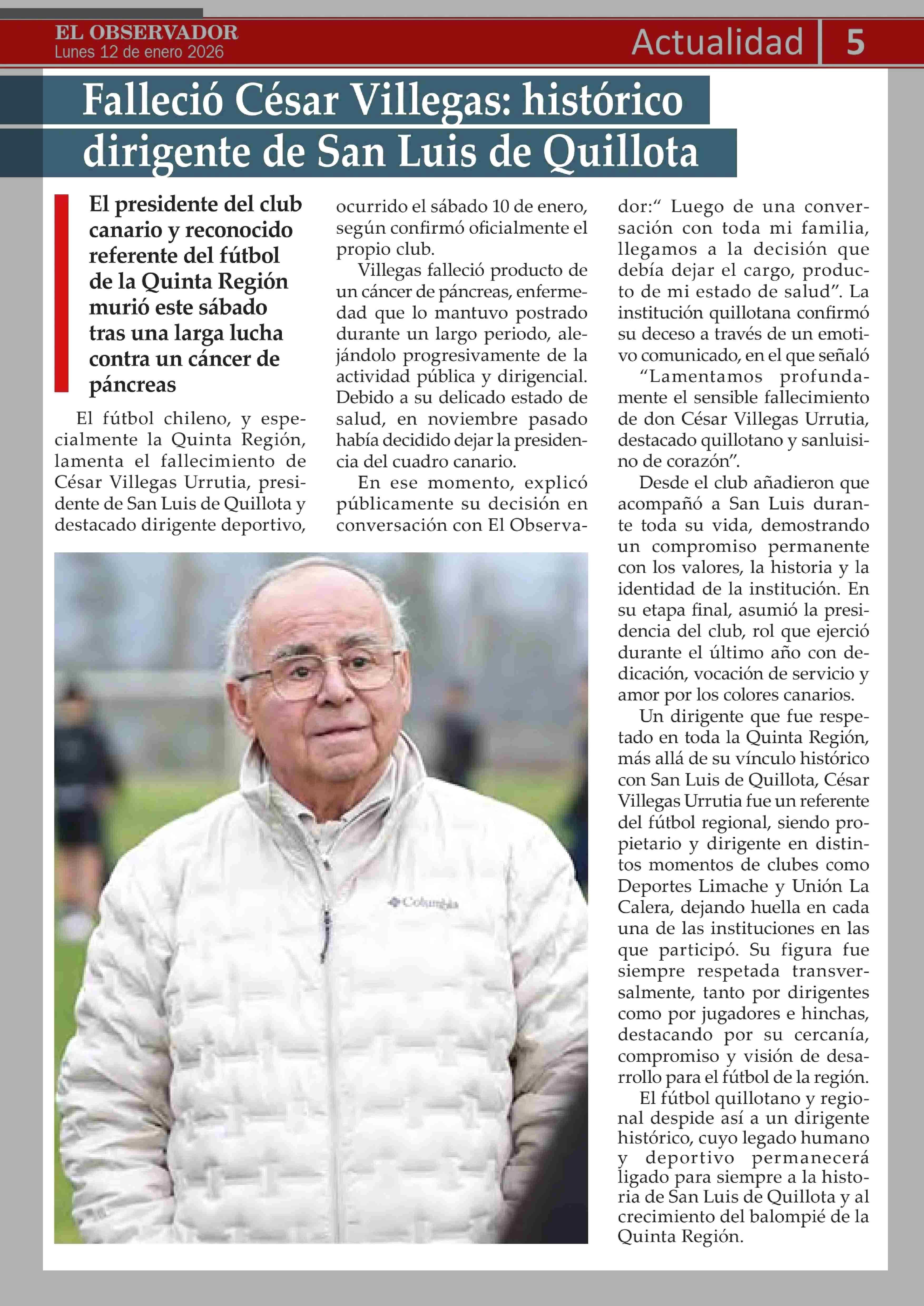 Falleció César Villegas: histórico dirigente de San Luis de Quillota 12-01-2026 El Observador Vespertino |