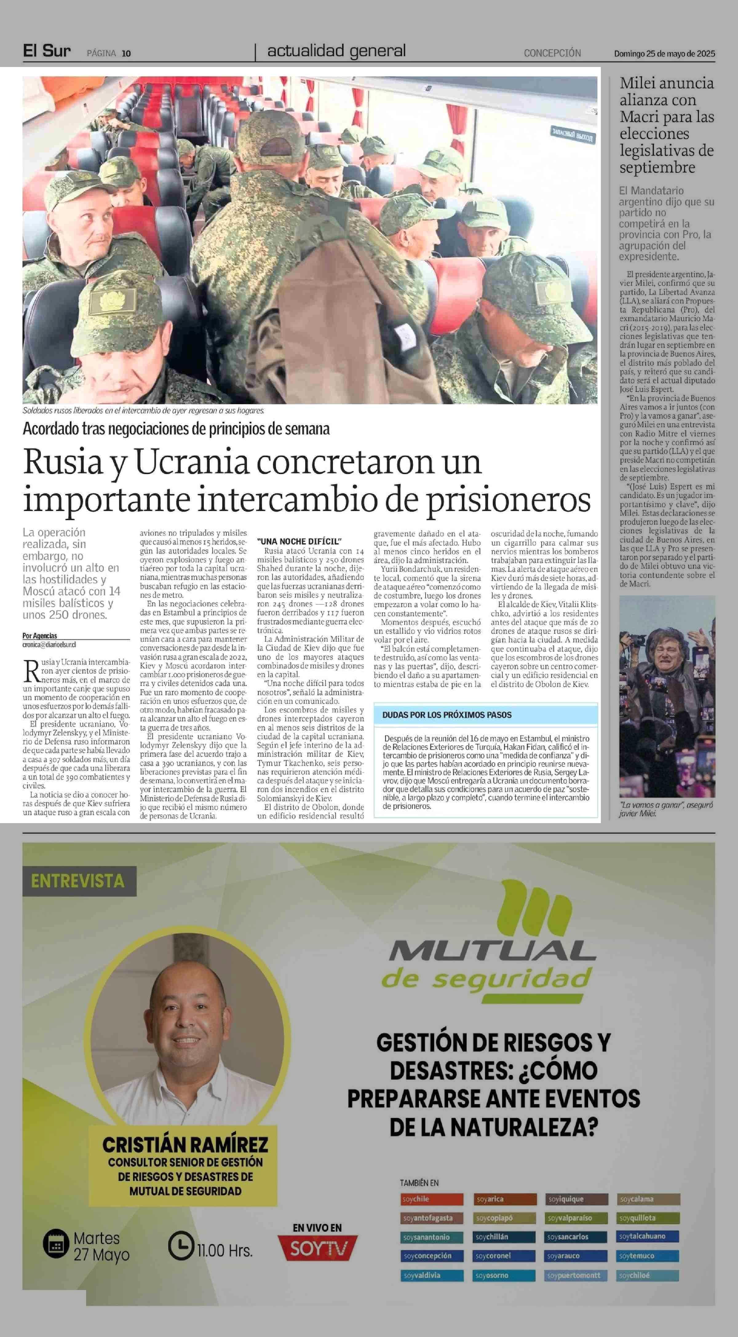 Rusia y Ucrania concretaron un importante intercambio de prisioneros 25-05-2025 El Sur |