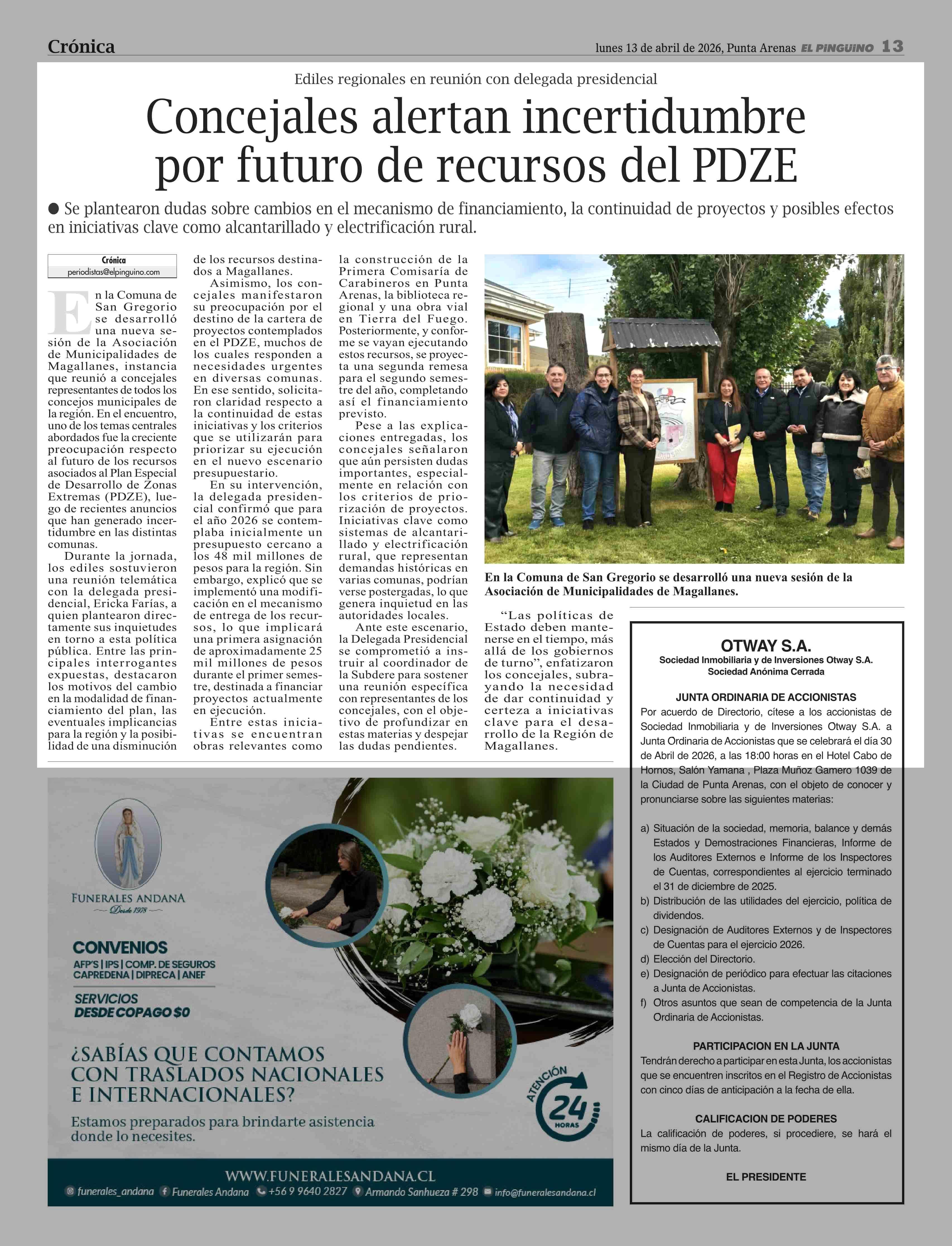 Concejales alertan incertidumbre por futuro de recursos del PDZE 13-04-2026 El Pingüino |
