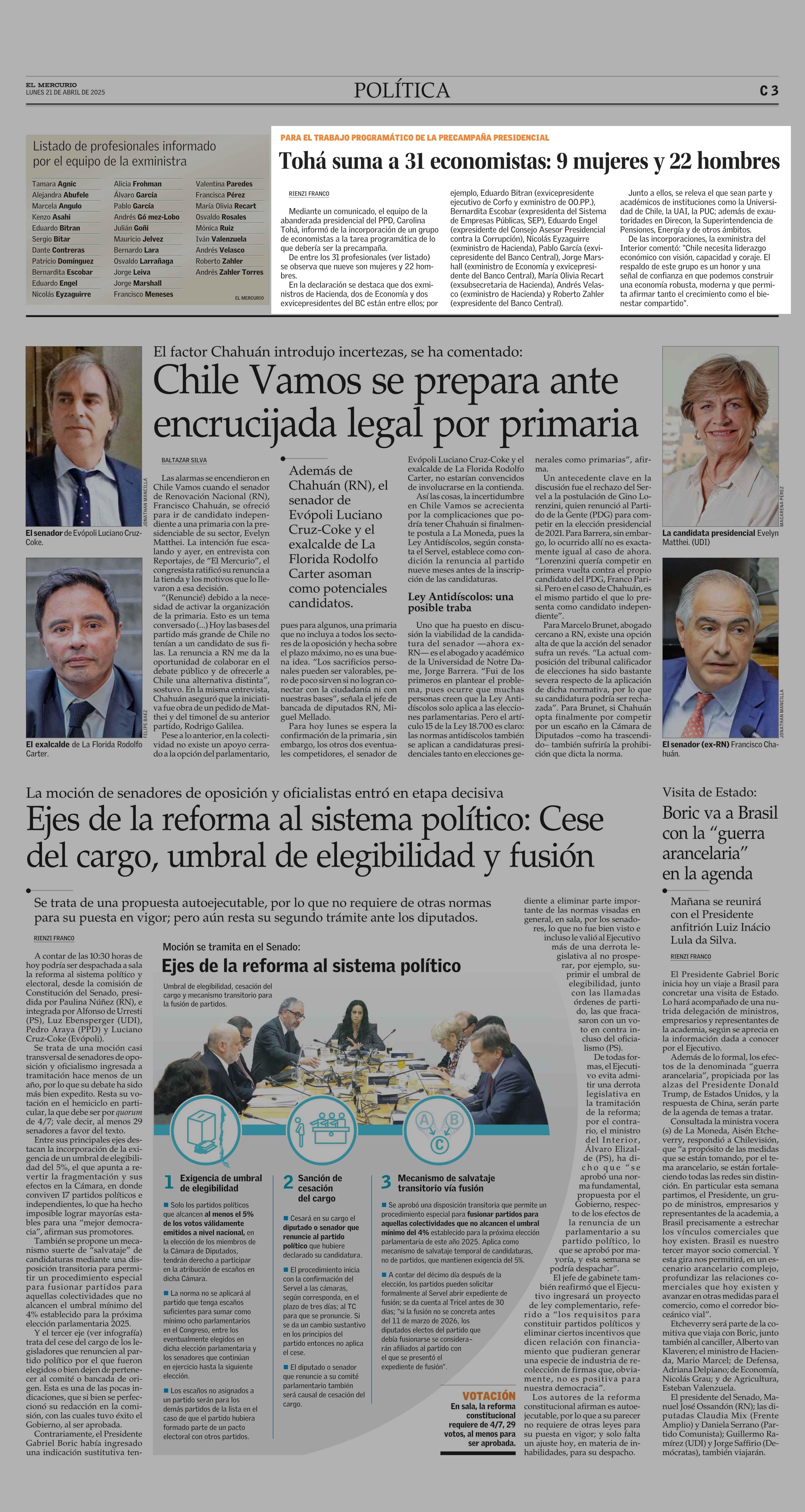 Tohá suma a 31 economistas: 9 mujeres y 22 hombres 21-04-2025 El Mercurio |