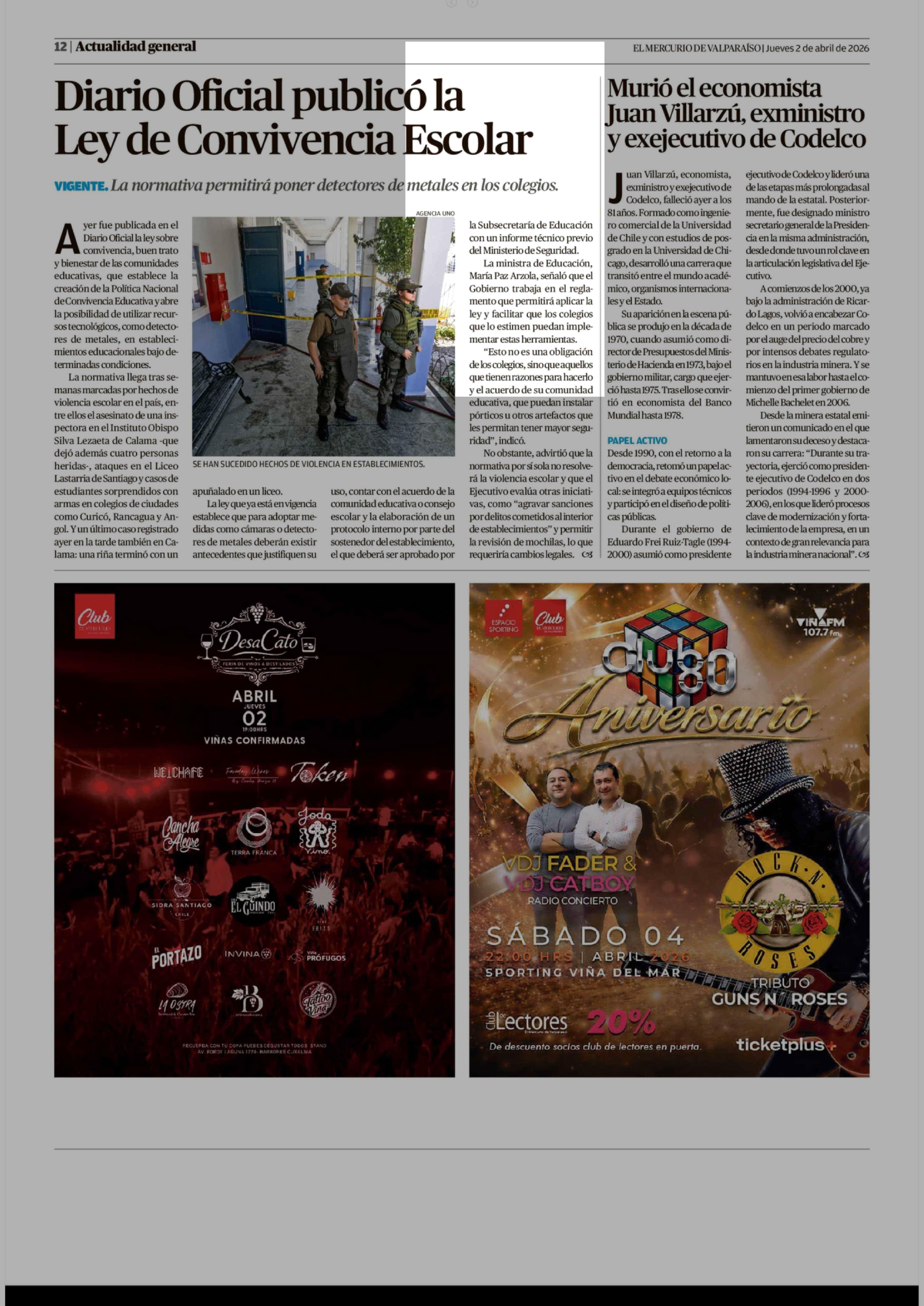 Murió el economista Juan Villarzú, exministro y exejecutivo de Codelco 02-04-2026 El Mercurio de Valparaíso |