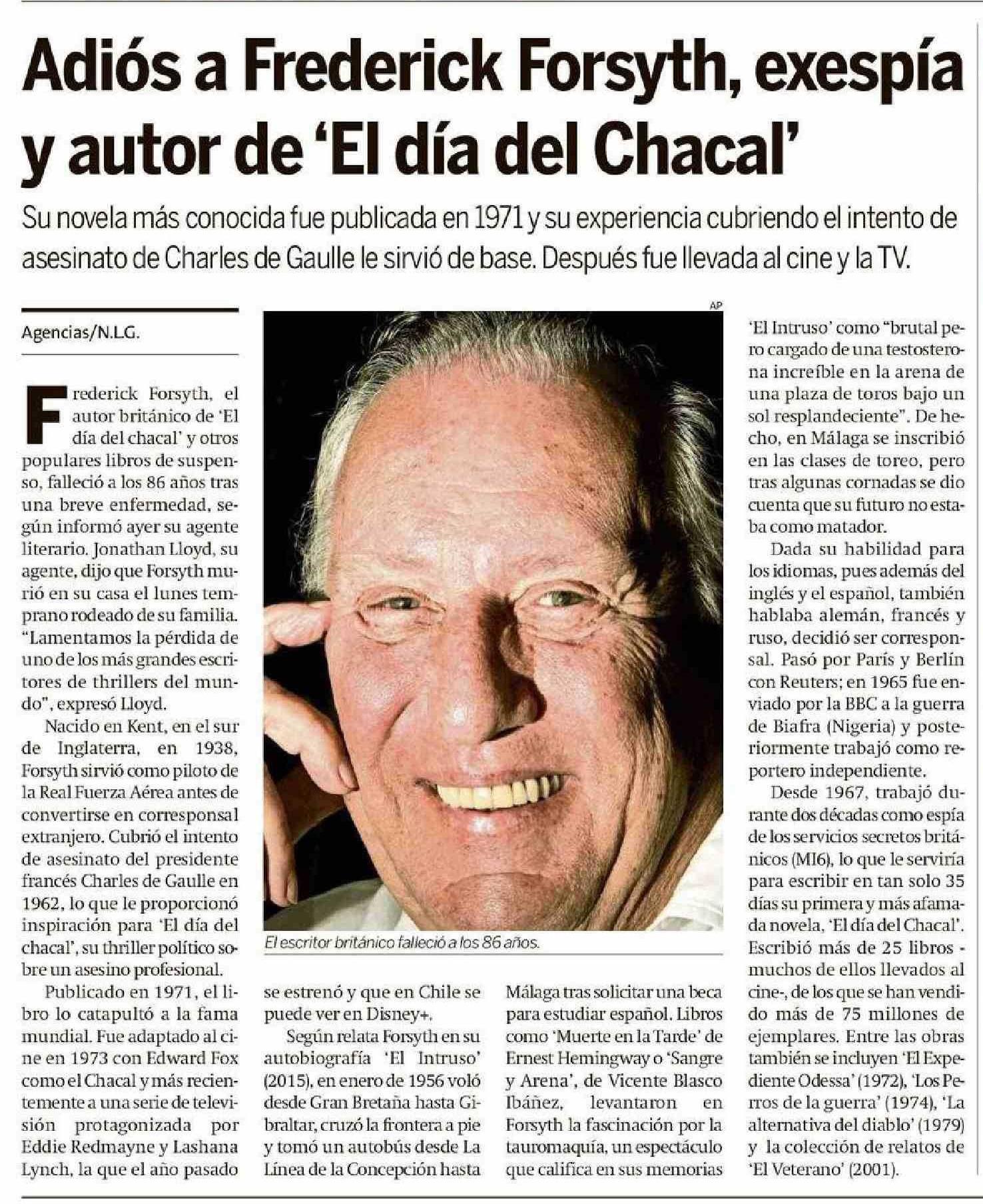 | Título: | Adiós a Frederick Forsyth, exespía y autor de “El día del Chacal' |