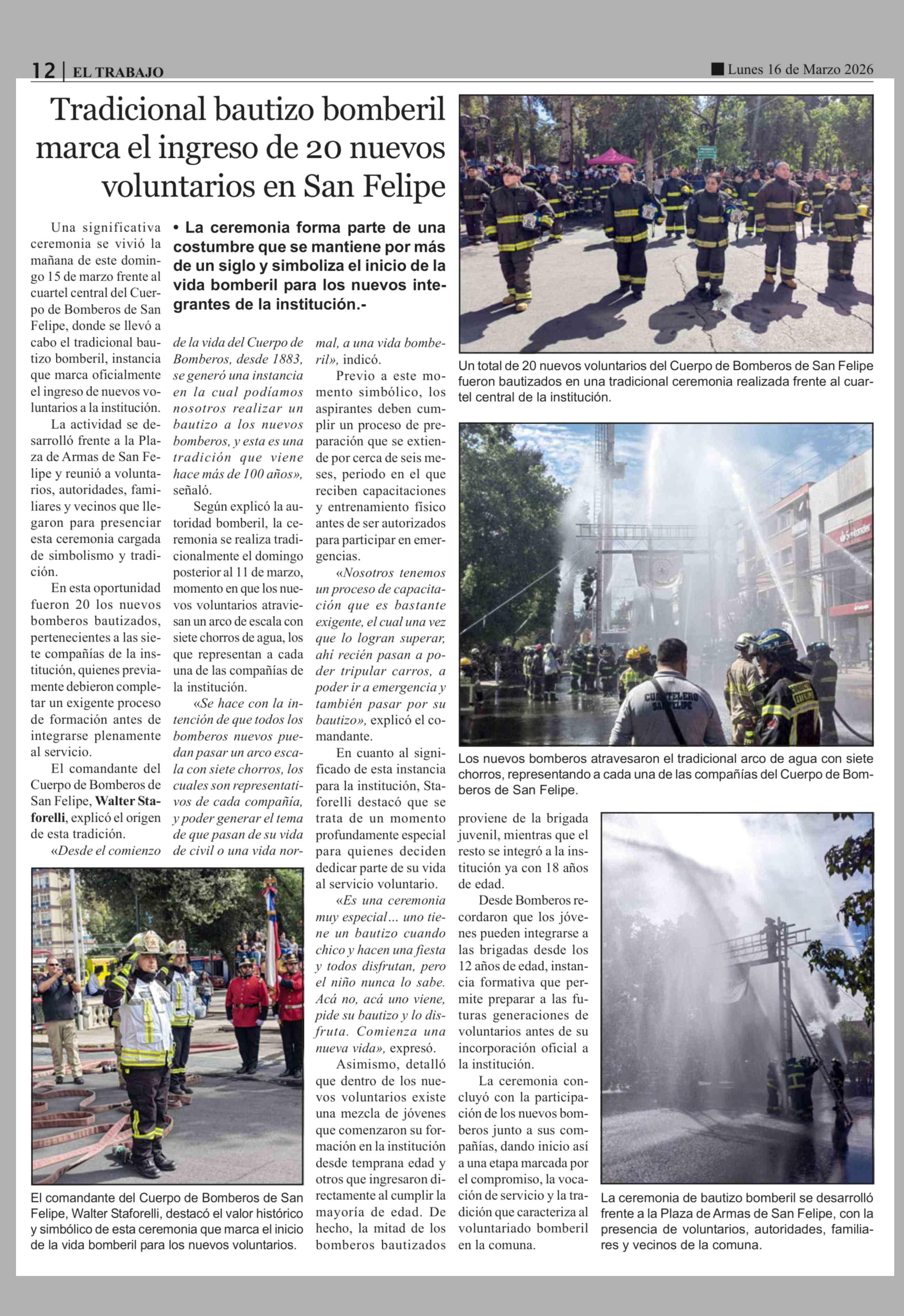 Título: Tradicional bautizo bomberil marca el ingreso de 20 nuevos voluntarios en San Felipe