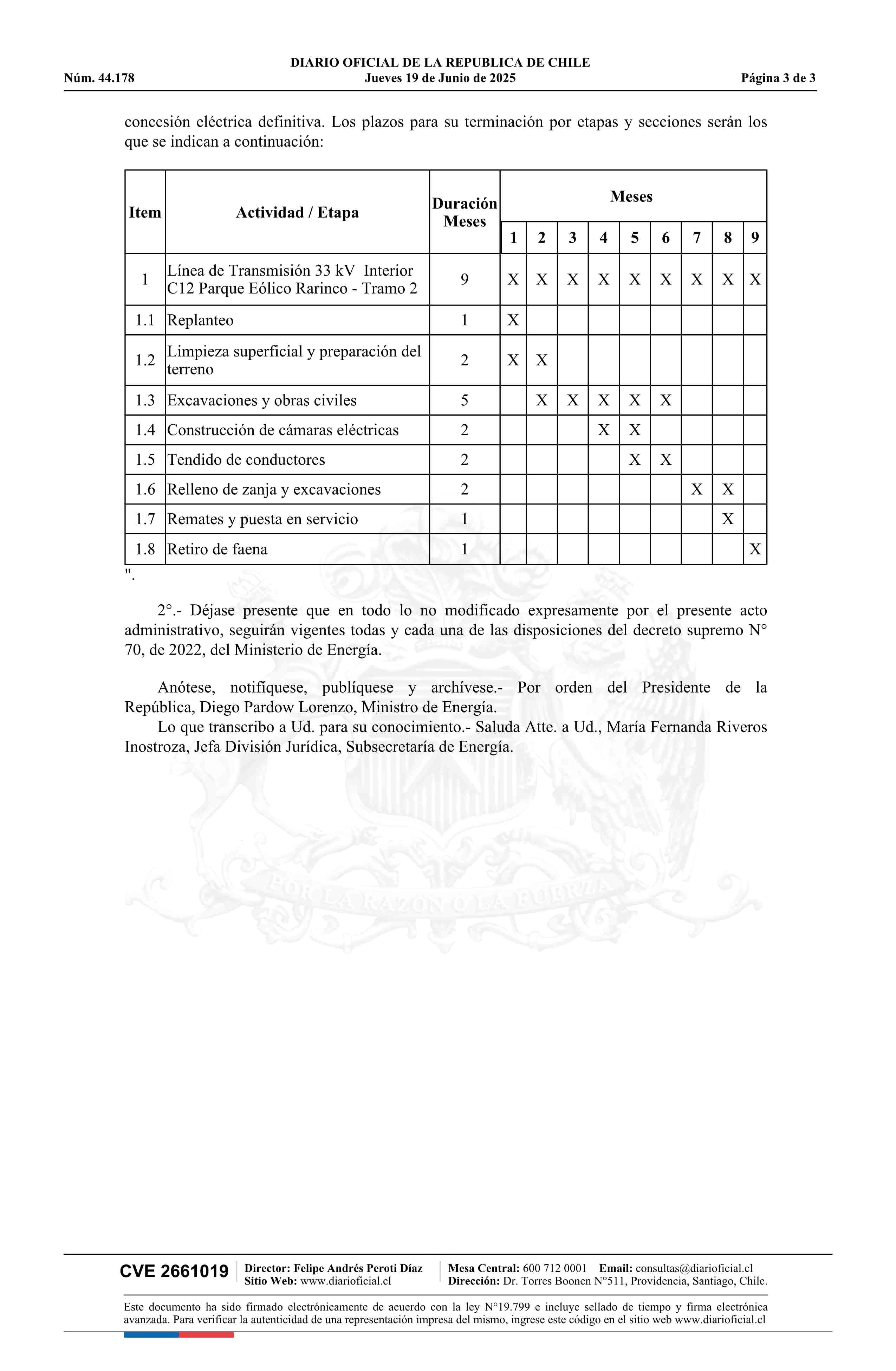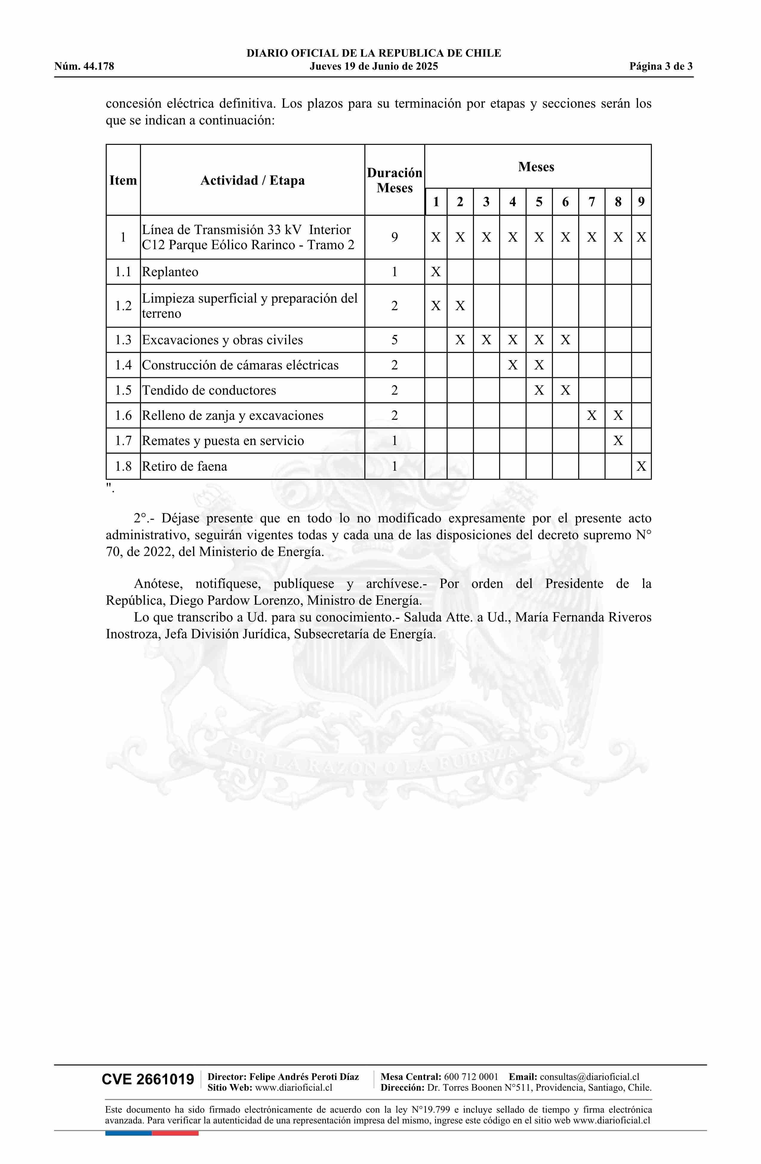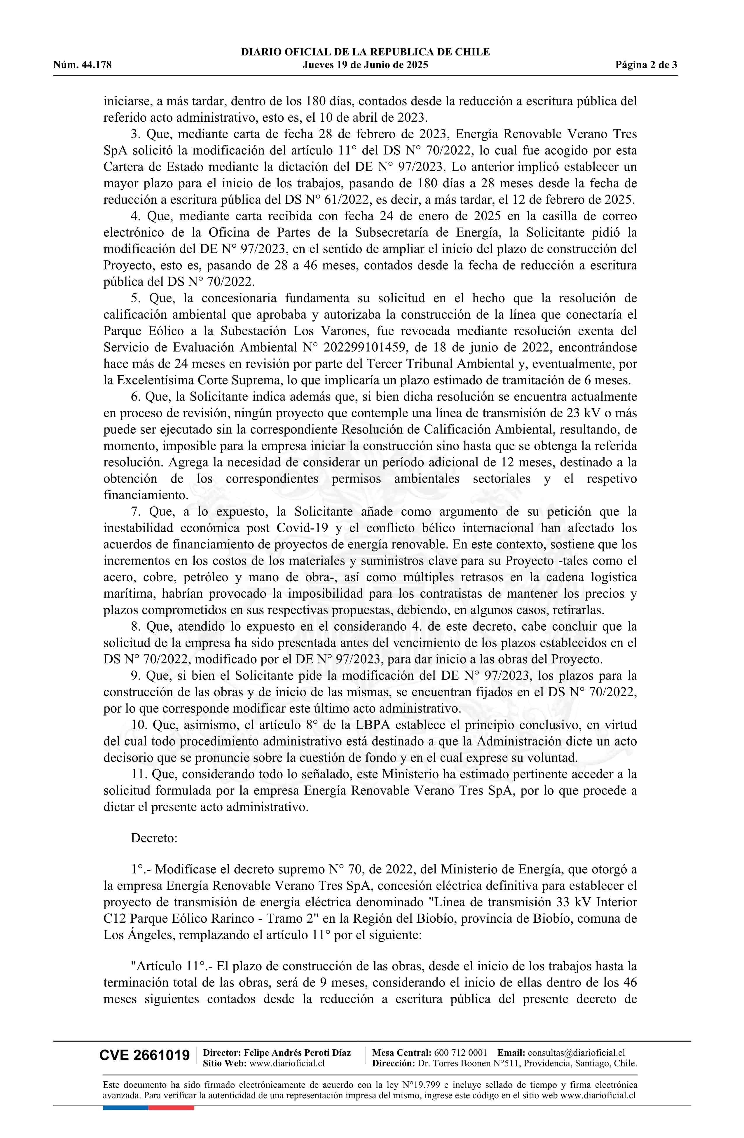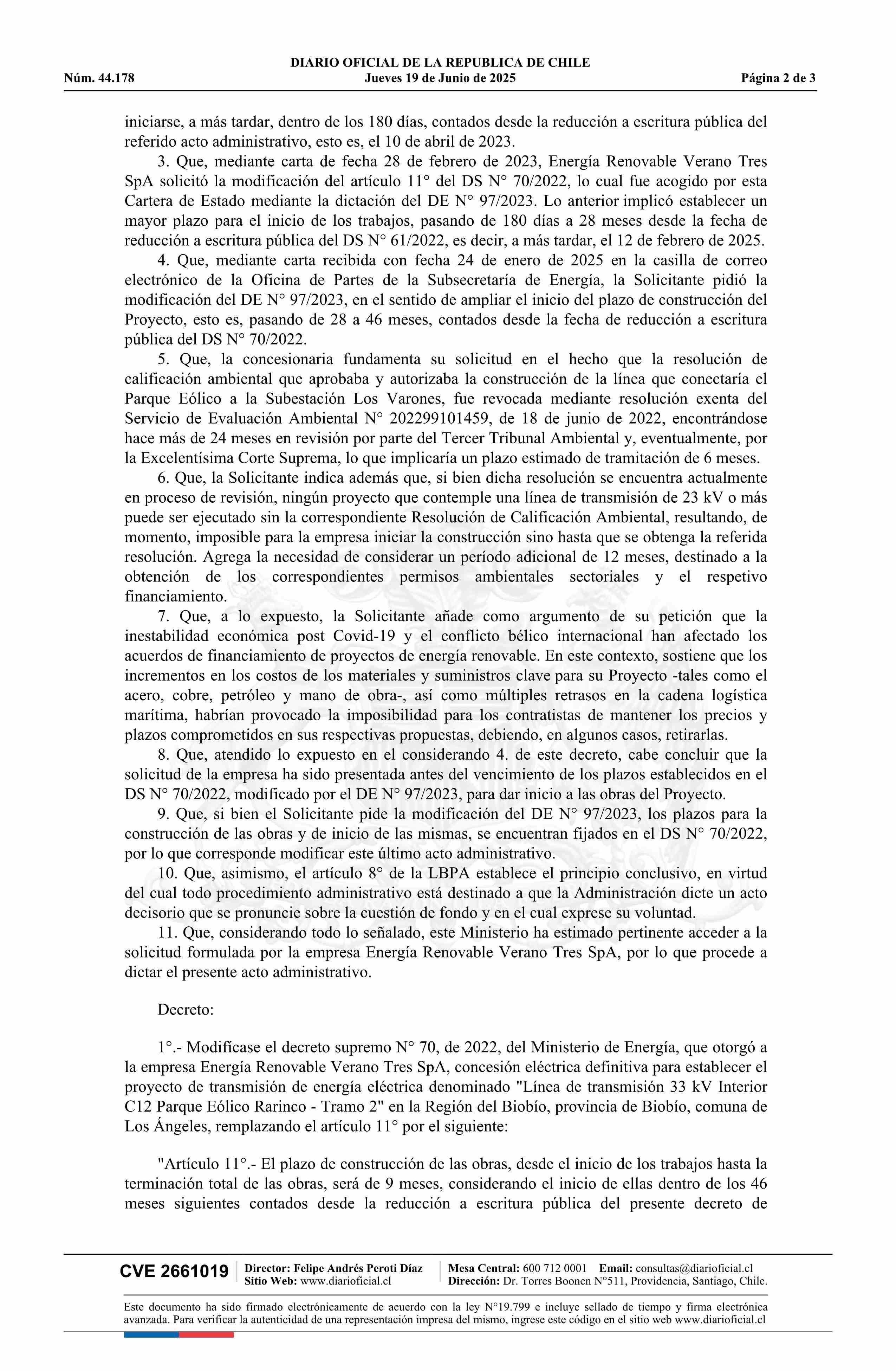 Título: Decreto exento número 145, de 2025.- Modifica decreto N° 70, de 2022, que otorga a Energía Renovable Verano Tres SpA concesión eléctrica definitiva para establecer el proyecto de transmisión de energía eléctrica denominado Línea de Transmisión 33 kV Interior C12 Parque Eólico Rarinco - Tramo 2, en l