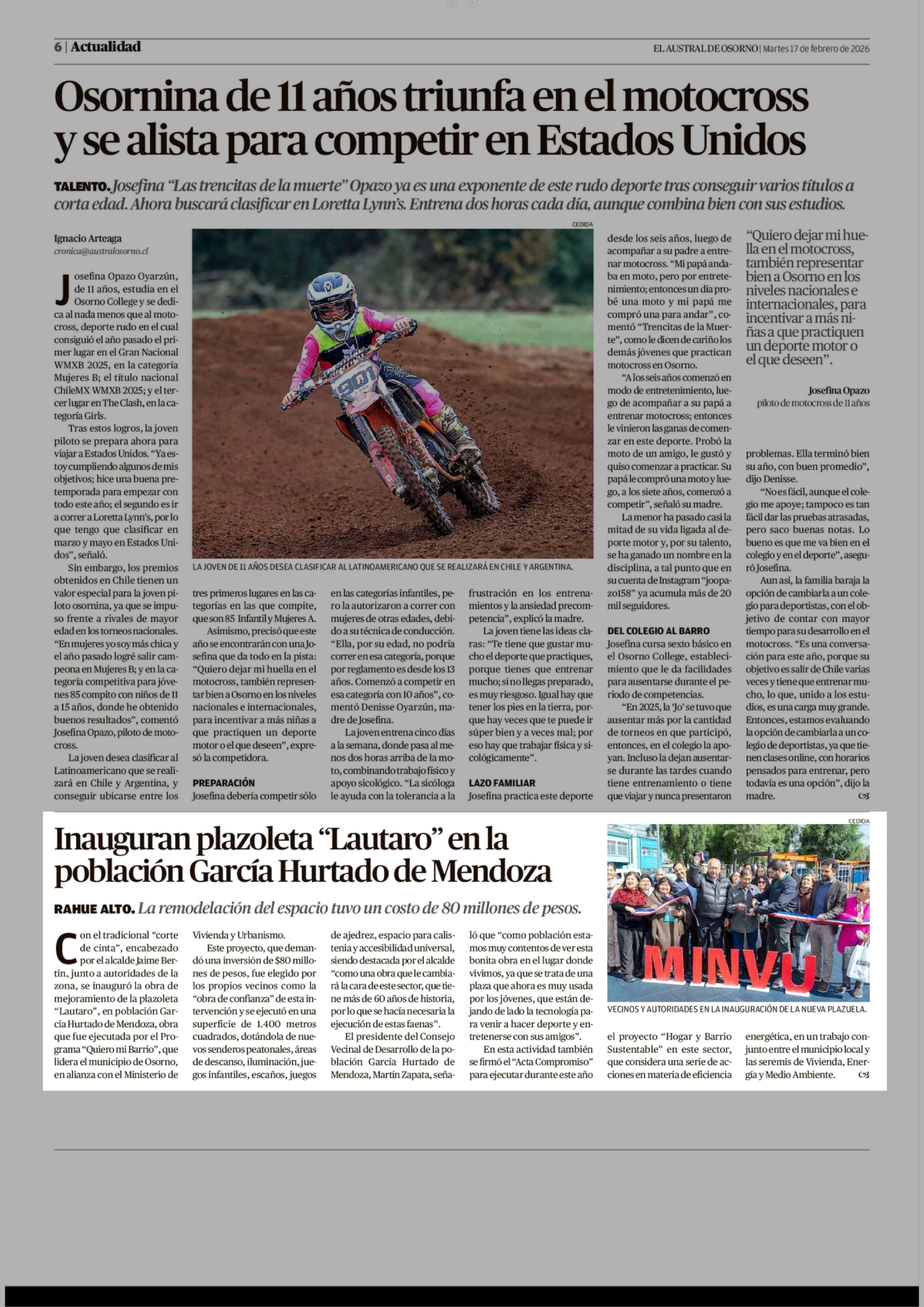 Inauguran plazoleta "Lautaro" en la población García Hurtado de Mendoza 17-02-2026 El Austral de Osorno |