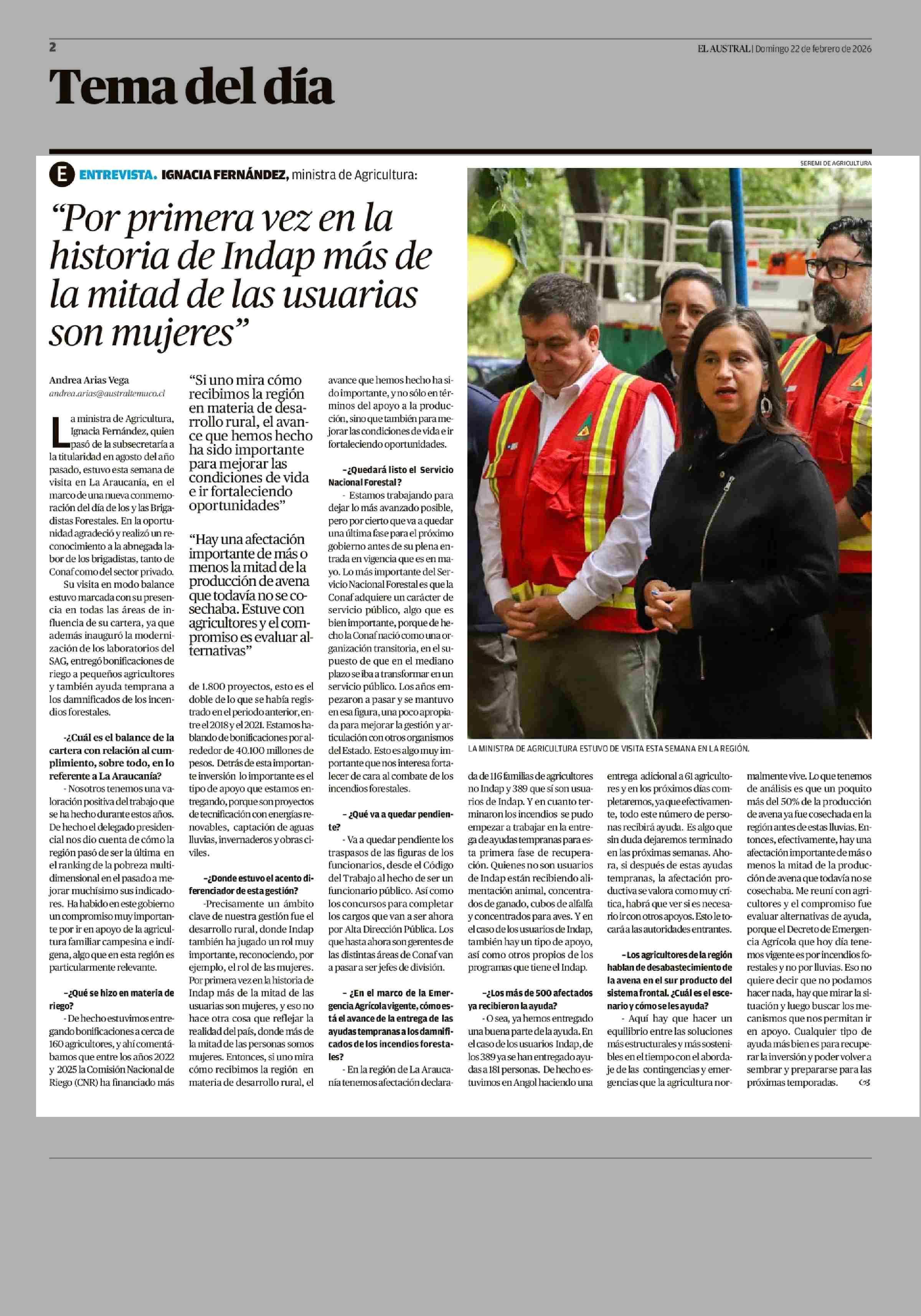 “Por primera vez en la historia de Indap más de la mitad de las usuarias son mujeres” 22-02-2026 El Austral de la Araucanía |