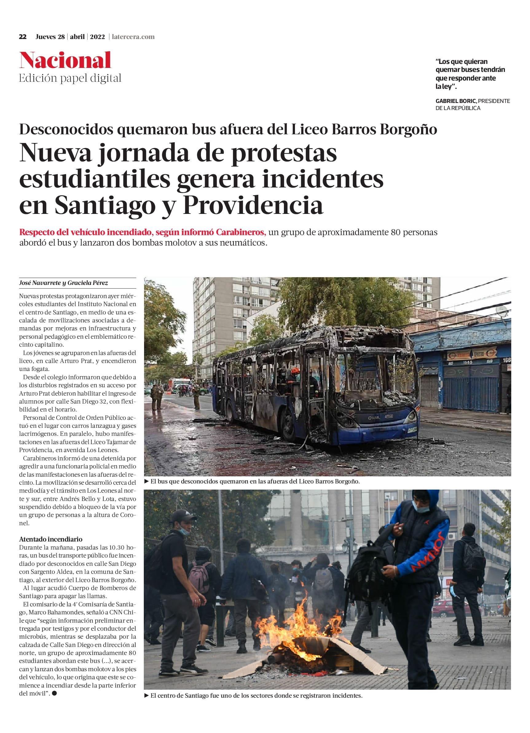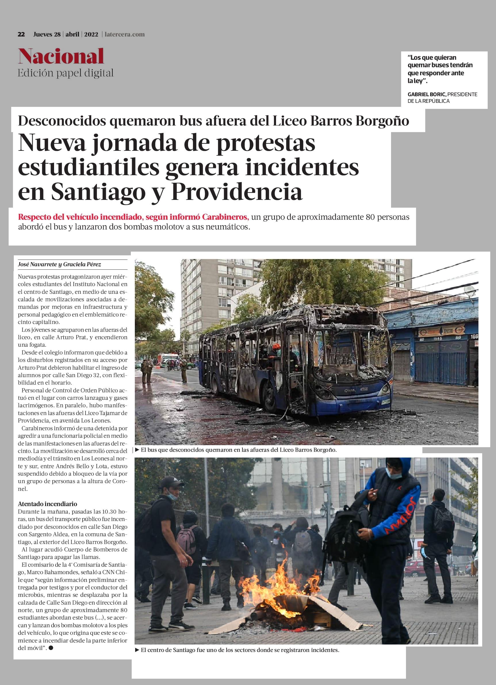 Nueva jornada de protestas estudiantiles genera incidentes en Santiago y Providencia 28-04-2022 La Tercera |