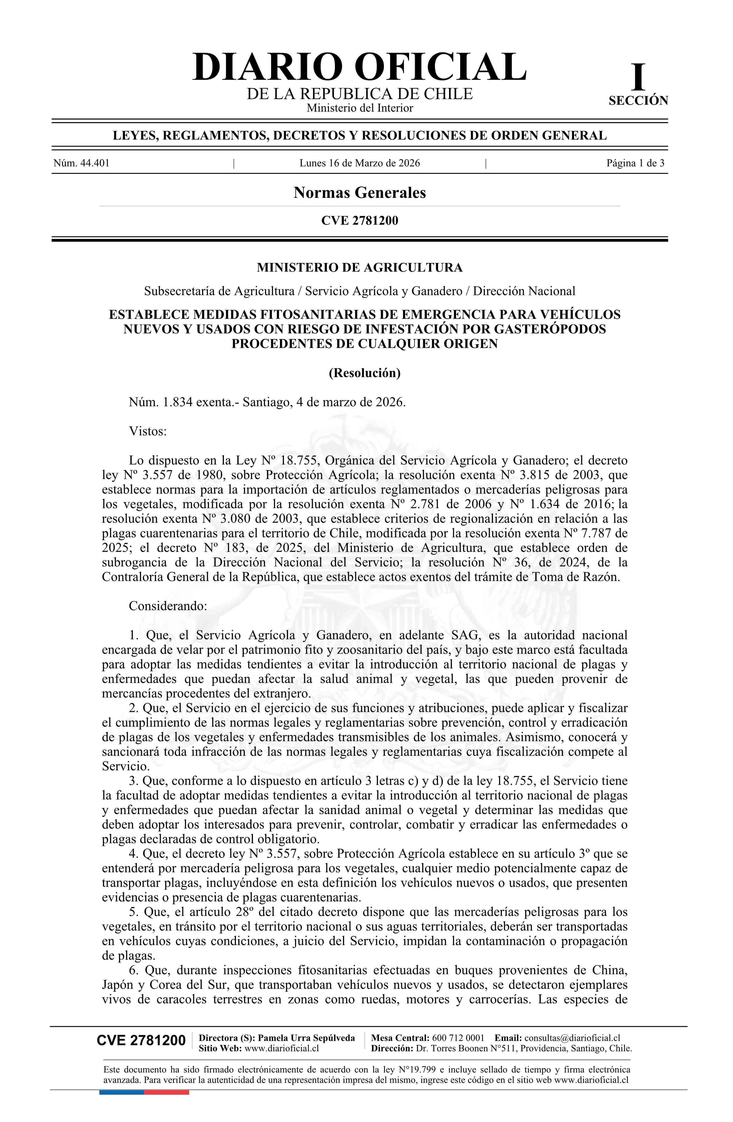 | Título: | Resolución exenta número 1.834, de 2026.- Establece medidas fitosanitarias de emergencia para vehículos nuevos y usados con riesgo de infestación por gasterópodos procedentes de cualquier origen |