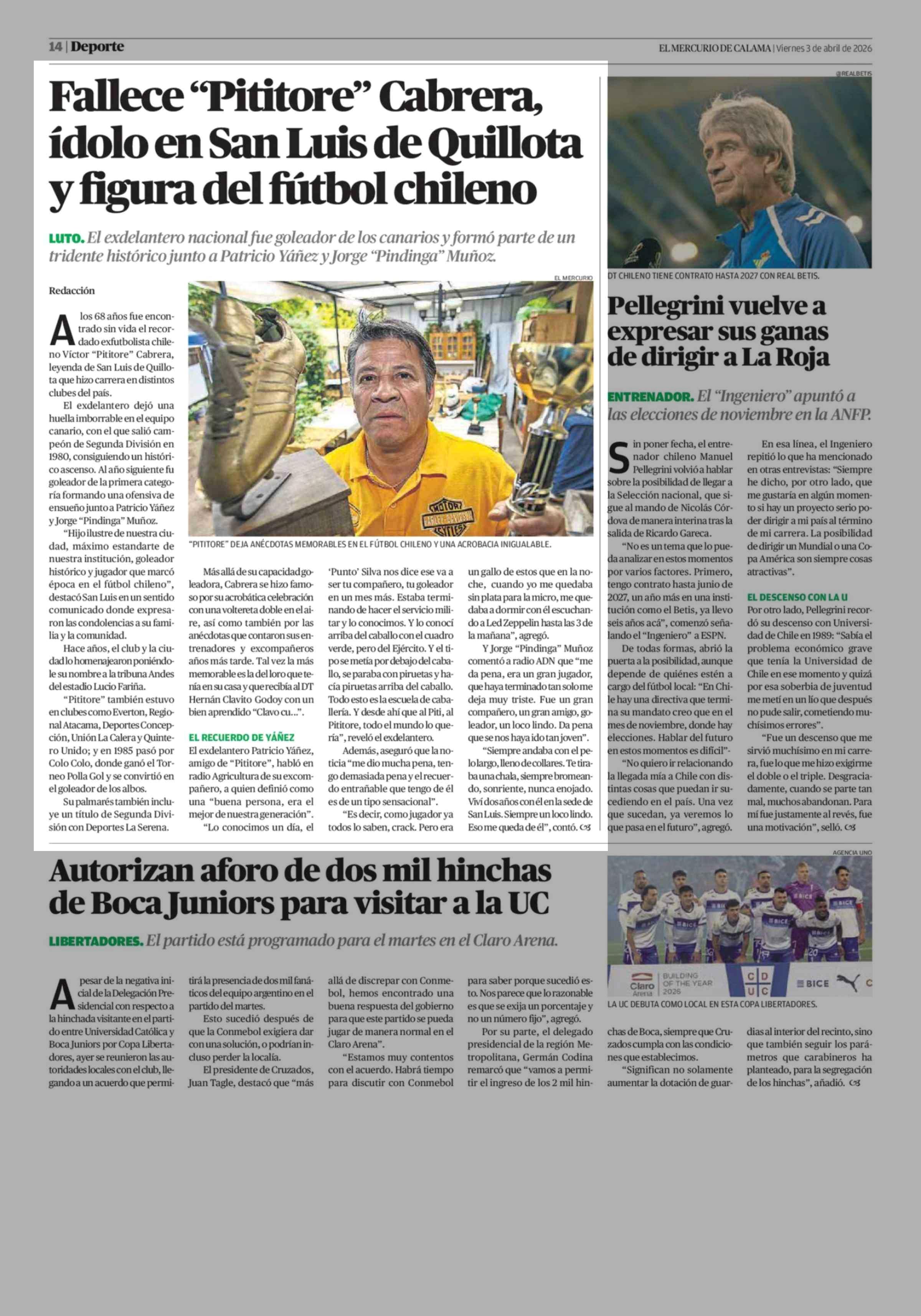 Fallece "Pititore" Cabrera, ídolo en San Luis de Quillota y figura del fútbol chileno 03-04-2026 El Mercurio de Calama |